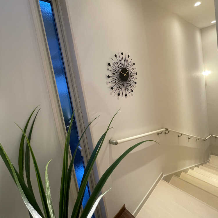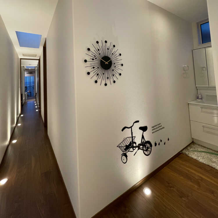 日中は白い壁に黒の芸術作品が浮かぶように見えますが、夜になって照明の光が当たると、今度は壁に影が映り込んで素敵。