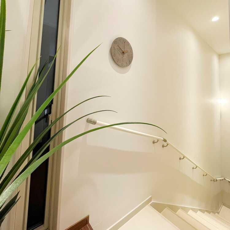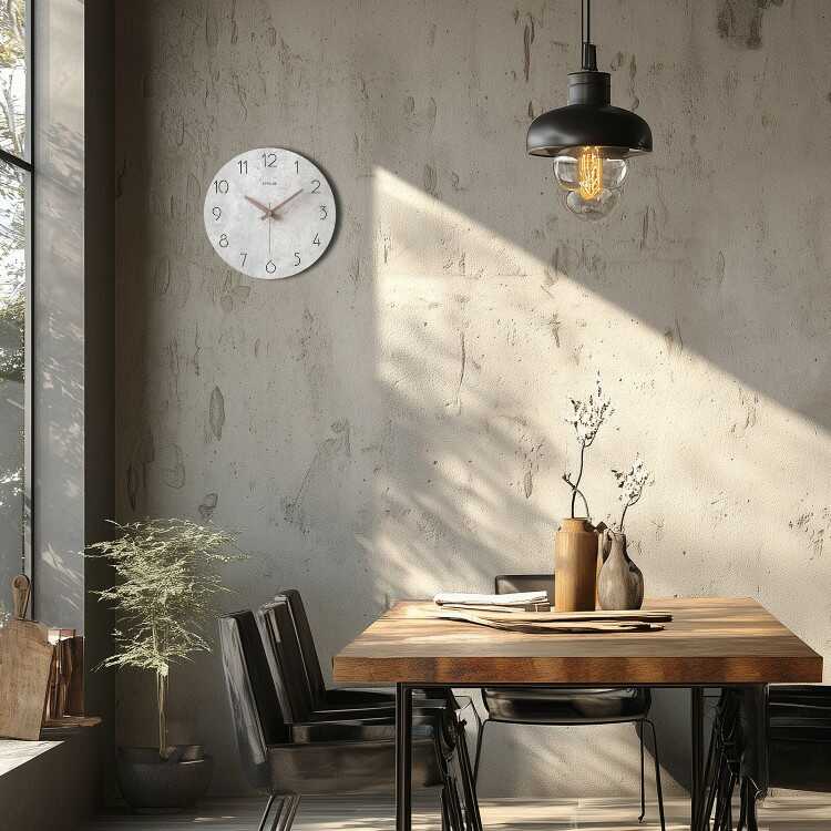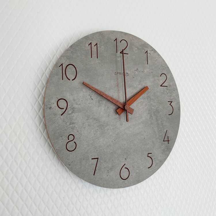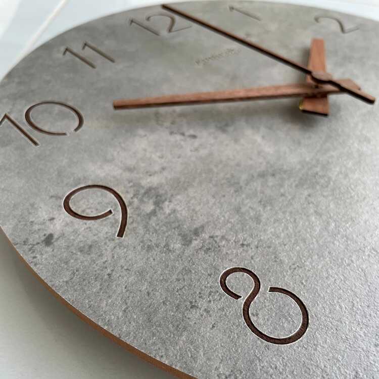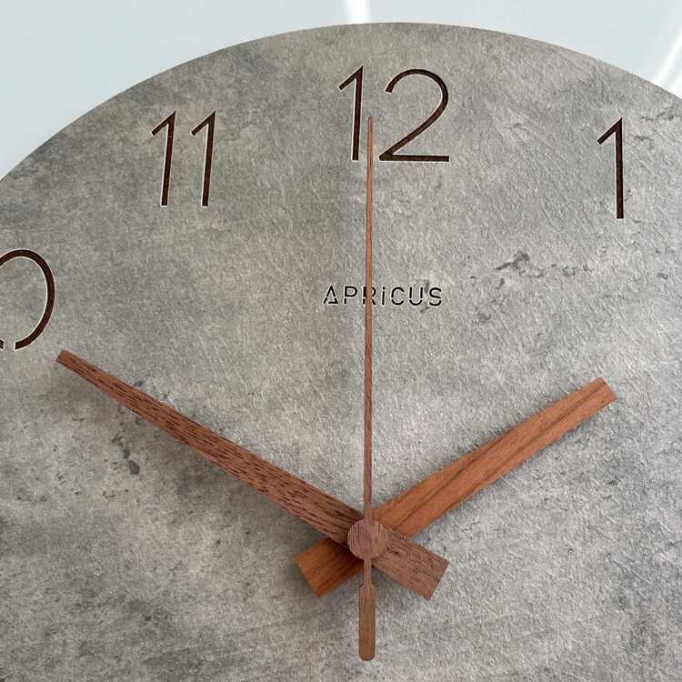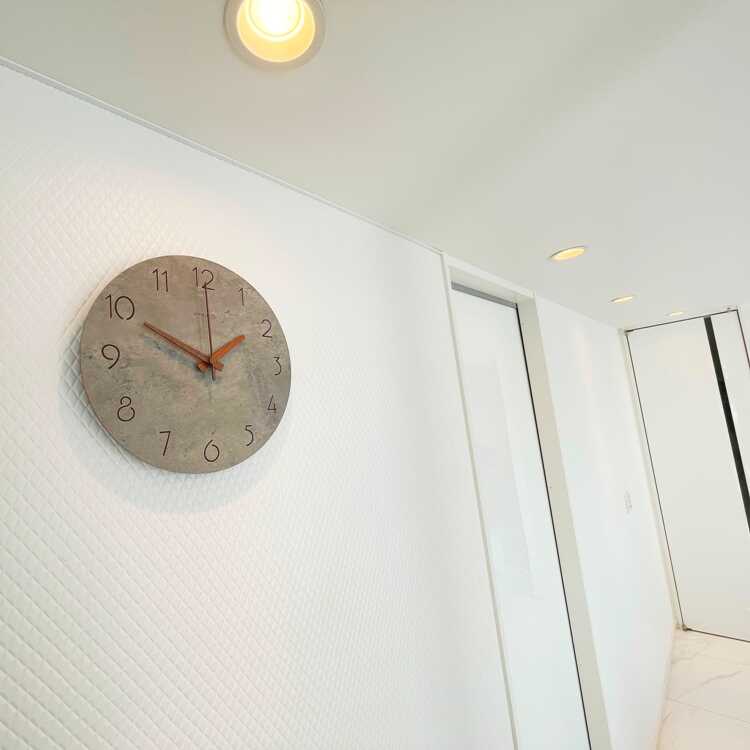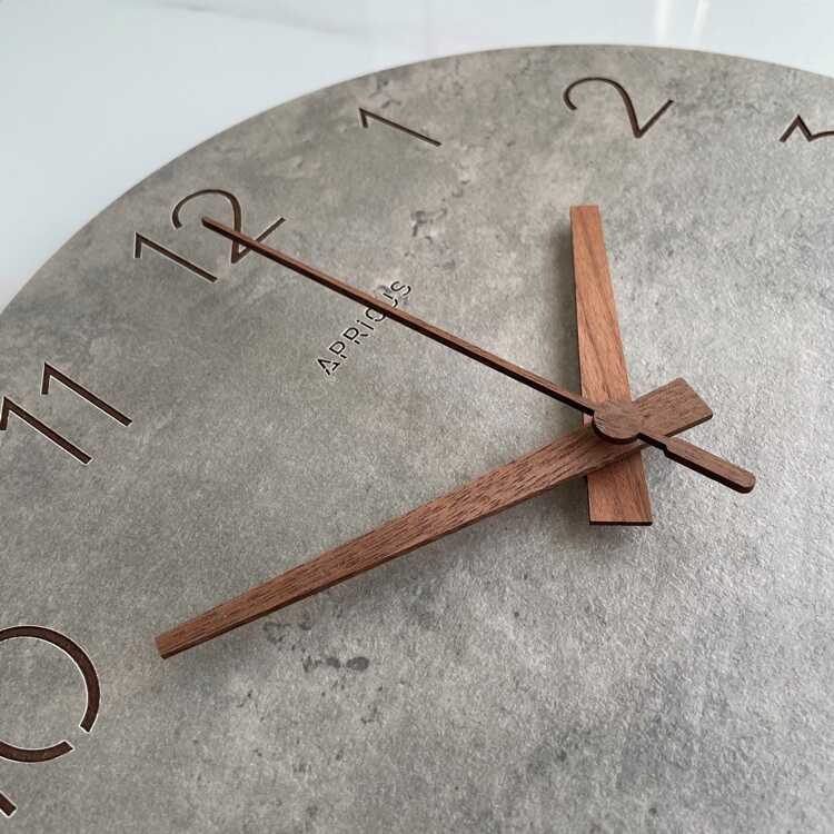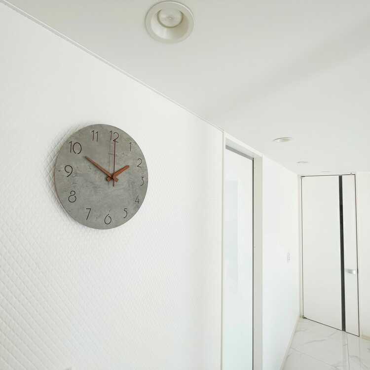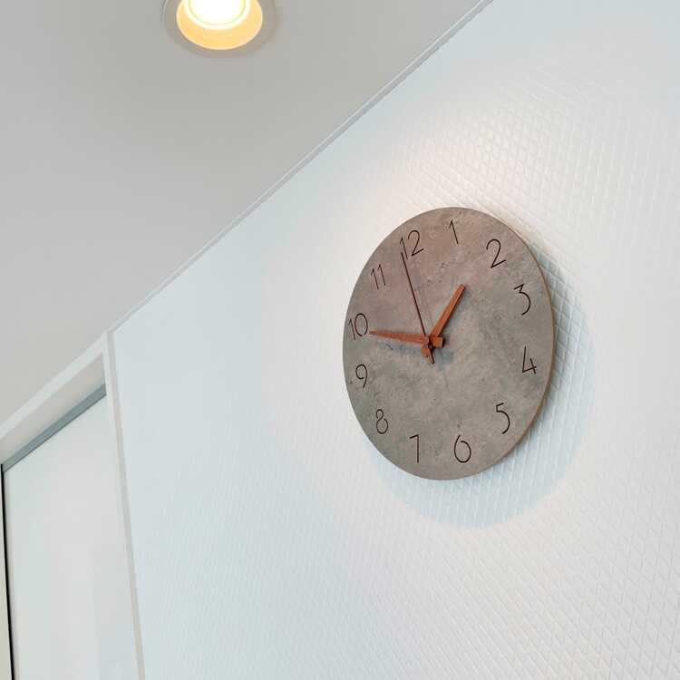 コンクリートの質感と木目調という異素材を組み合わせが、予想以上の相性の良さを見せる壁掛け時計。