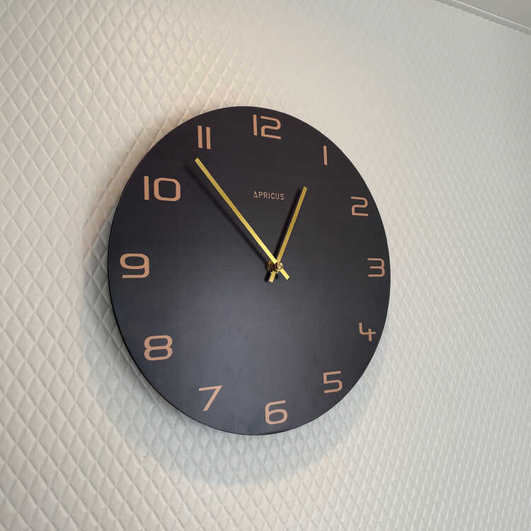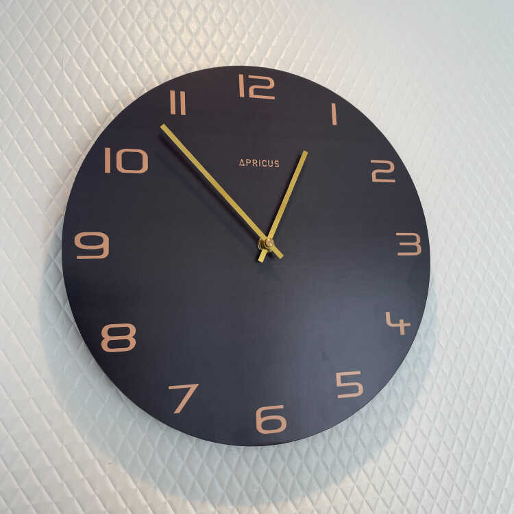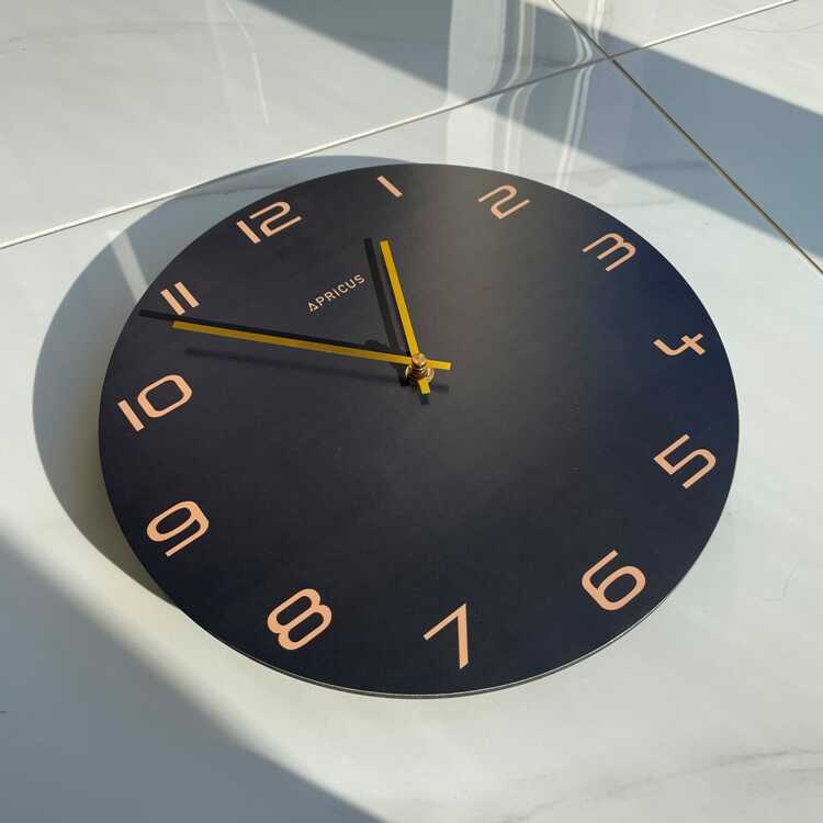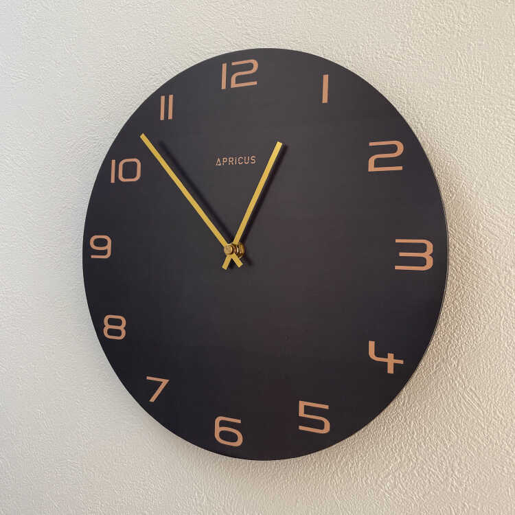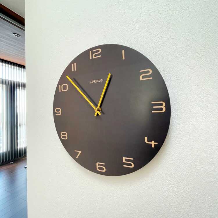 黒ブラックの盤面にゴールド系のアラビア数字を配したシンプルな壁掛け時計。