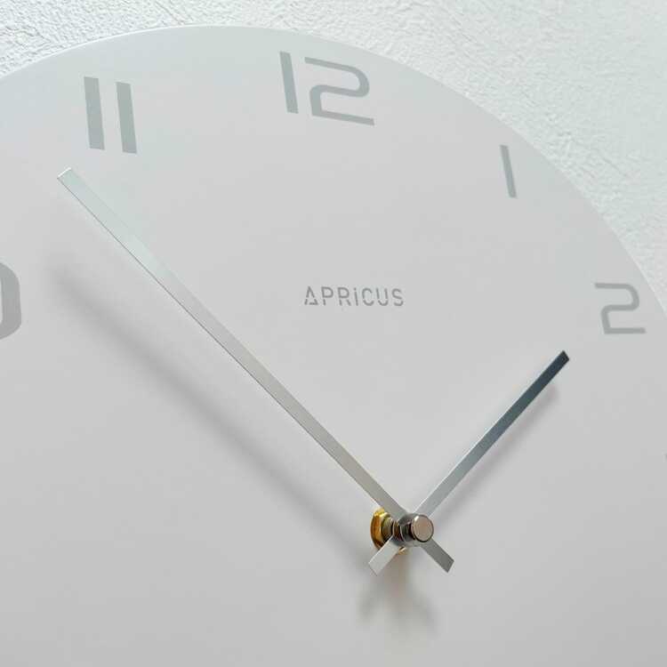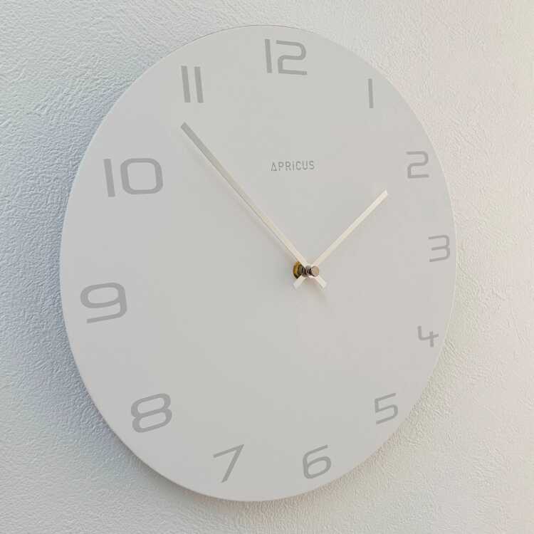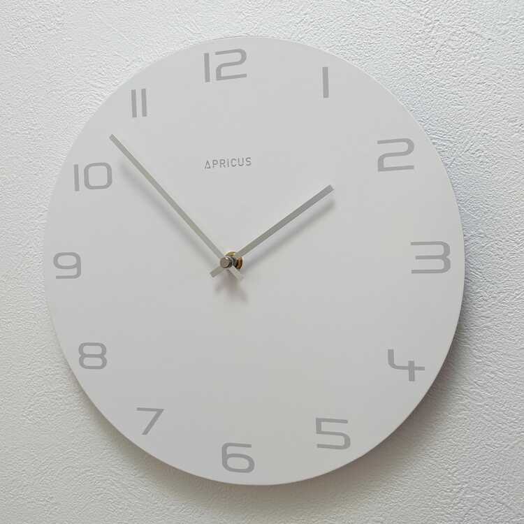 白ホワイトの盤面にシルバー色の数字と針を配した壁掛け時計。