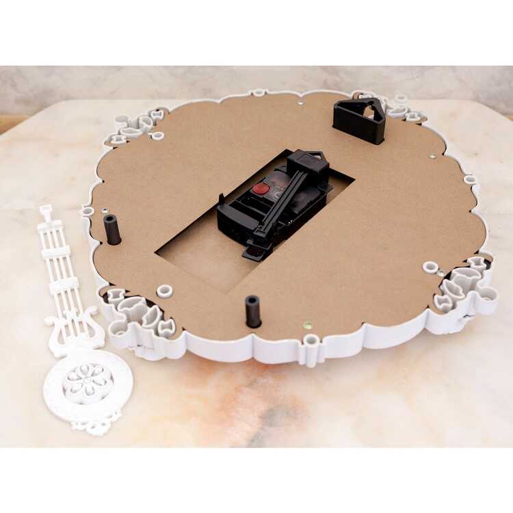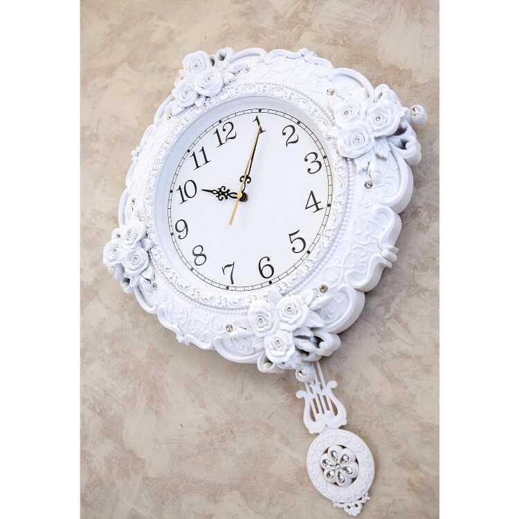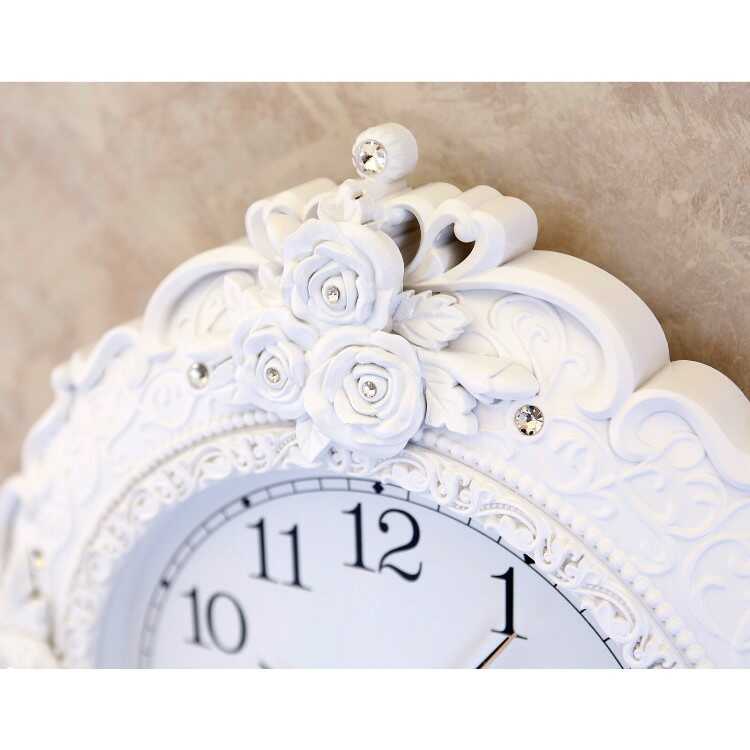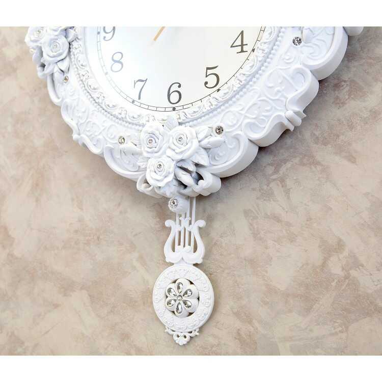 清楚なホワイトのフレームに薔薇の装飾をあしらったエレガントな壁掛け振り子時計。