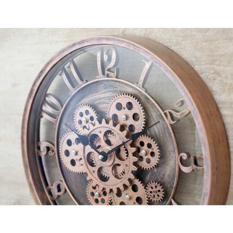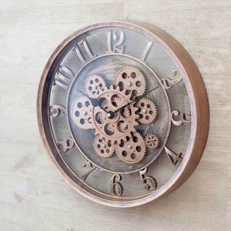 中央のギアが回転する、アンティーク感溢れる壁掛け時計。