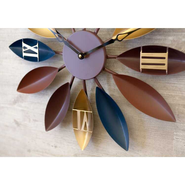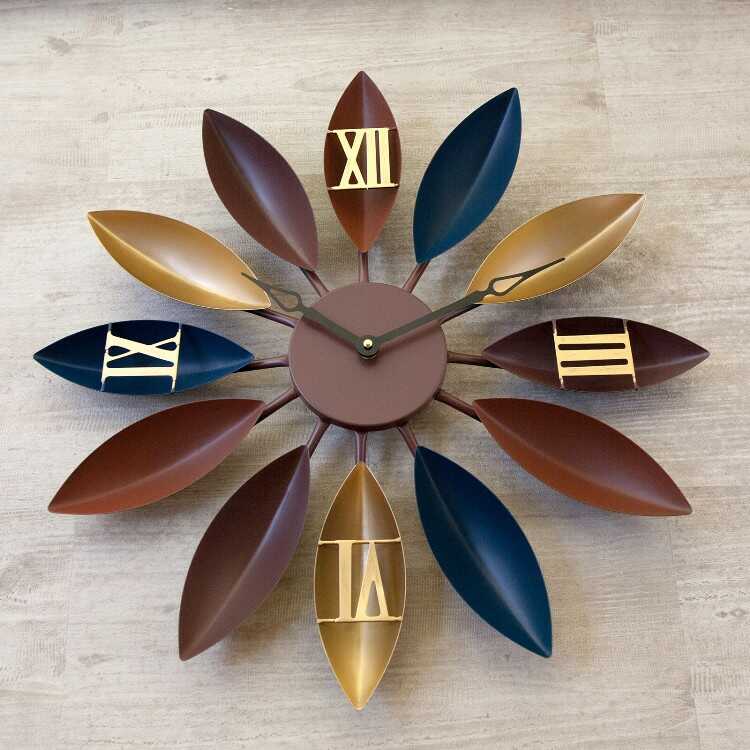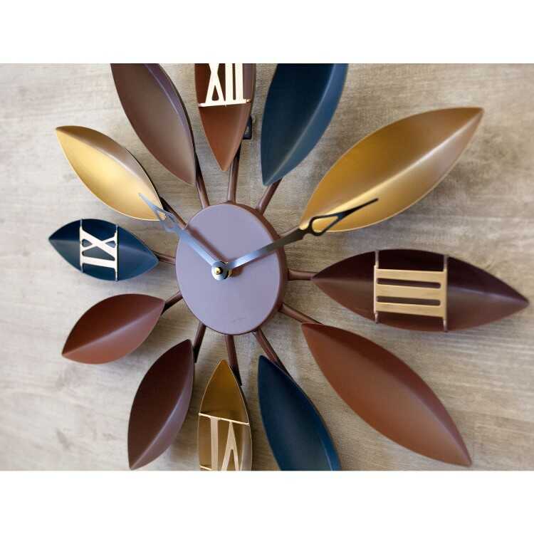 12枚のリーフ型アクセサリーを並べた個性的なデザインの壁掛け時計。