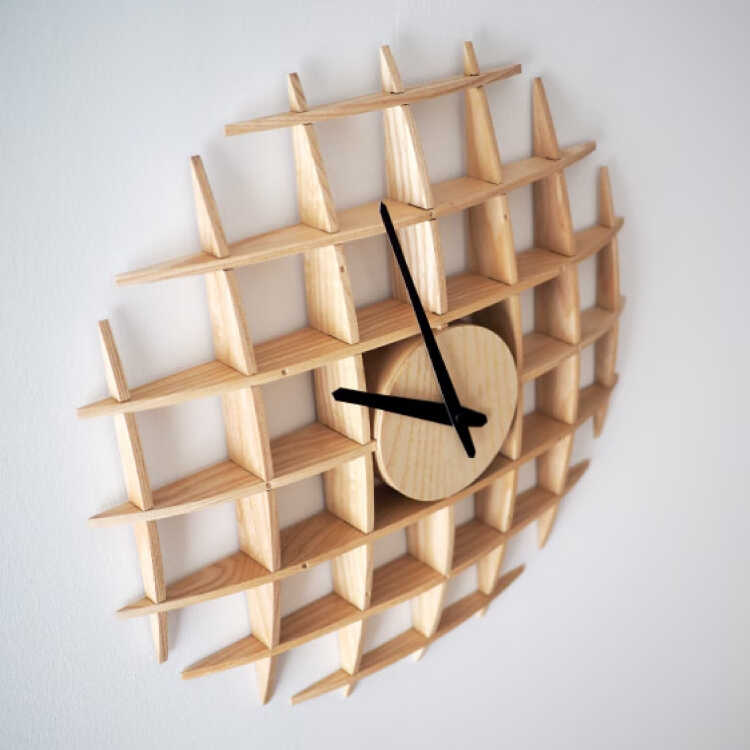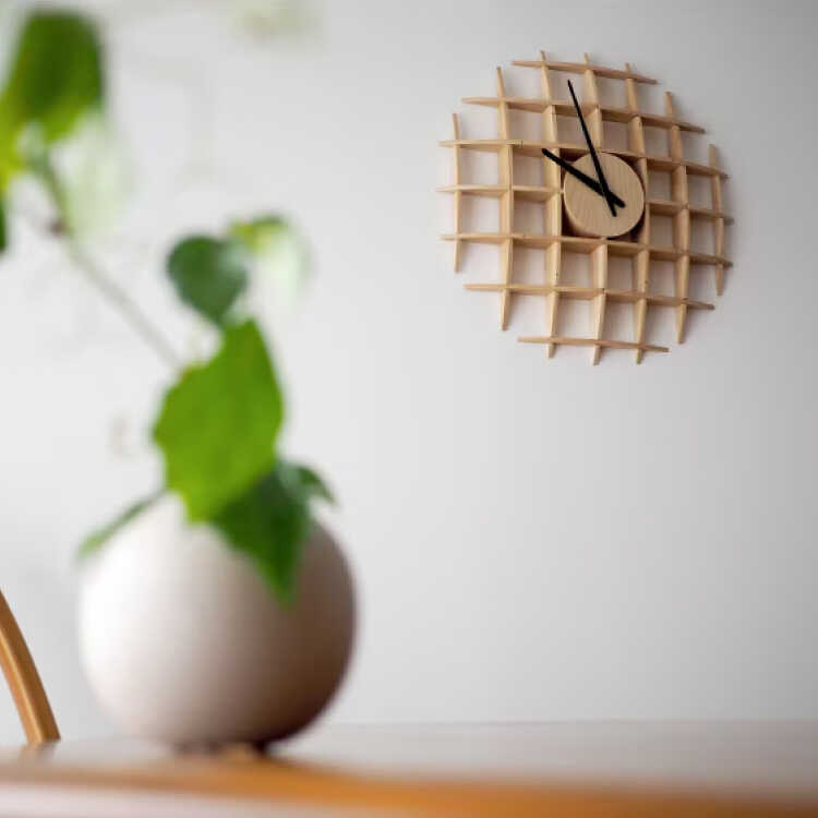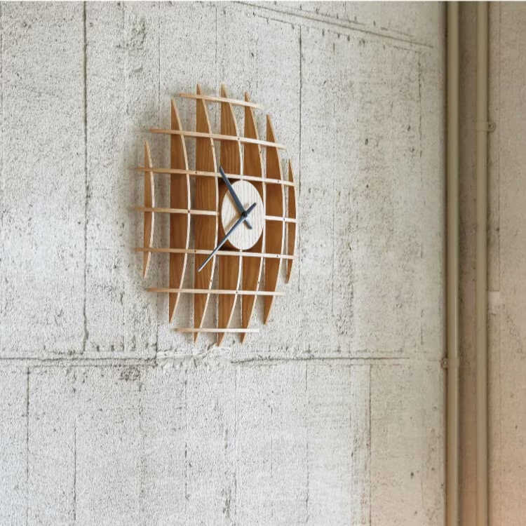 ナチュラル色のウッドをまるで木組み建築のようなフォルムで表現した壁掛け時計。