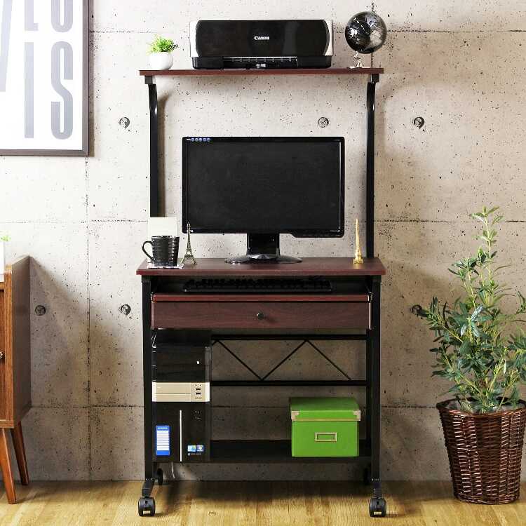 幅75cm・キャスター付き多機能パソコンデスク(ハイタイプ・ブラウン色)