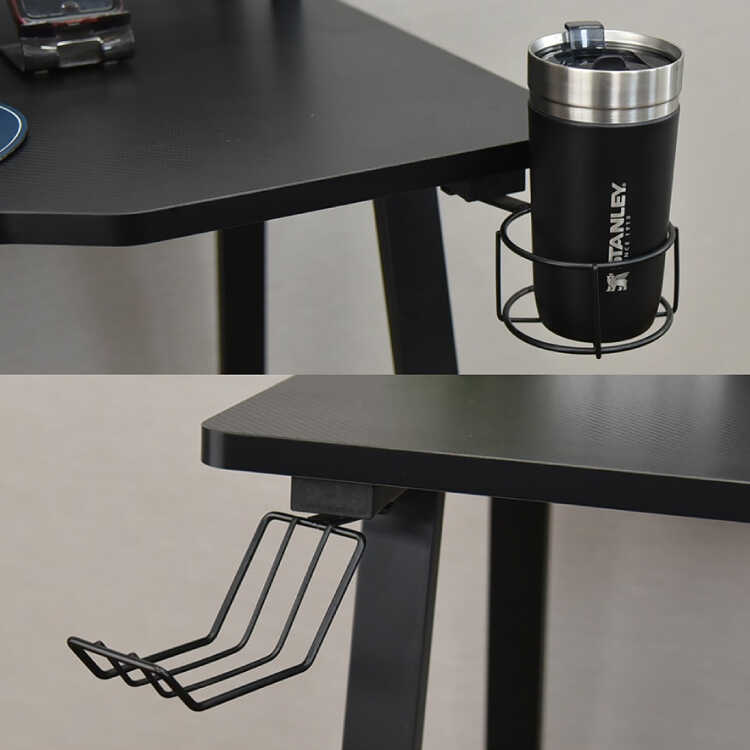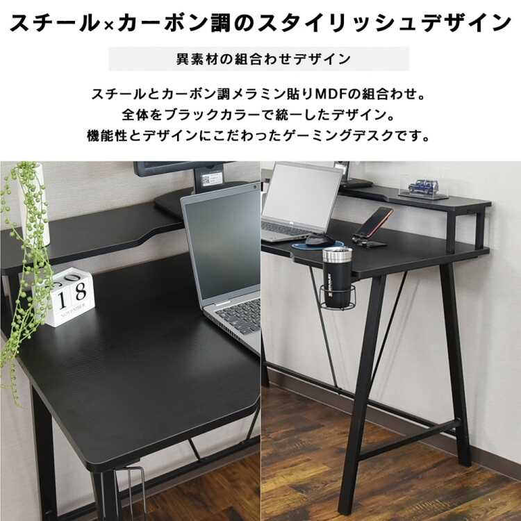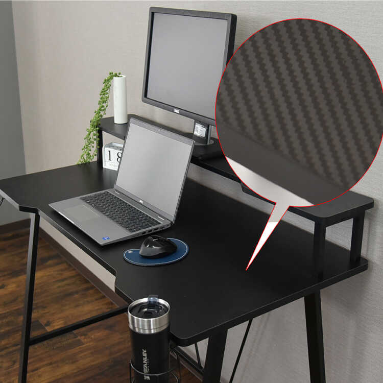 天板を広く使えるモニタースタンドの採用や、ドリンクホルダー&ヘッドホンホルダーの付属、カーボン調メラミン貼りによる耐久性など、リーズナブルな価格設定にも関わらず魅力が詰まったPCデスクです。