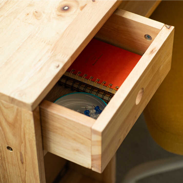 端には引出しを配置、無垢材で箱組されたしっかりとした作りで、取手ではなく丸くくり抜いた部分に指を掛けて引き出します。
