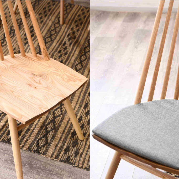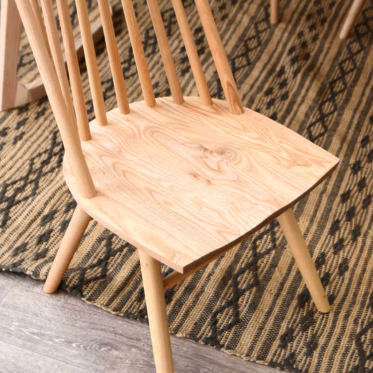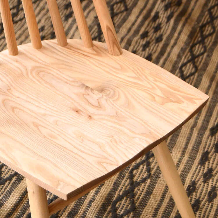 座面はアッシュ材の豪快な木目がふんだんに味わえ、これぞ「木製椅子」と実感できるクオリティー。