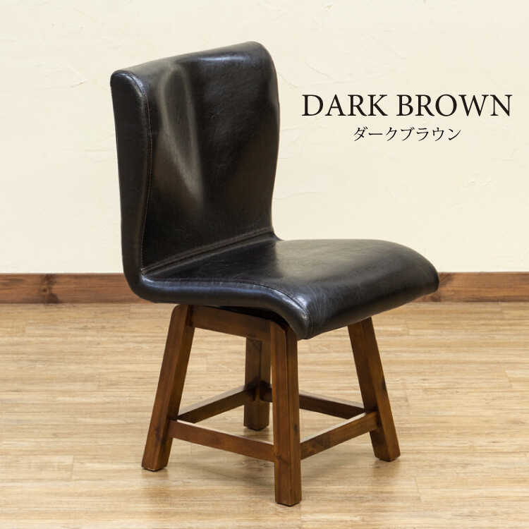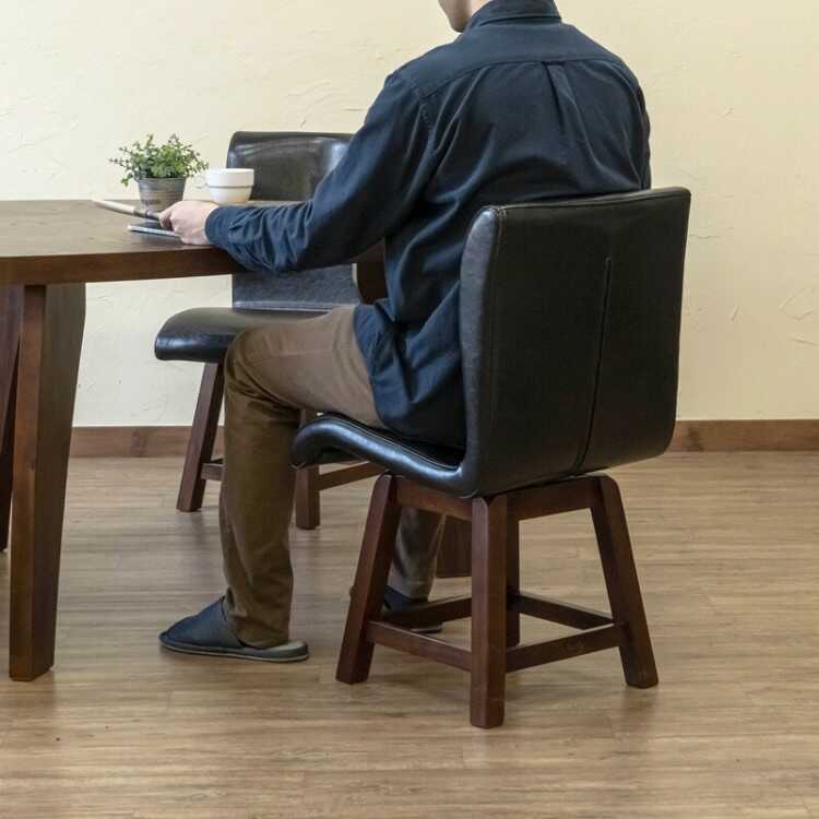立ち座りがしやすい!PUレザー製のダイニング回転チェア。座面が360度回転するのでチェアを引かず立ち上がることができ、足腰が不自由な方や高齢者の方にもおすすめです。回転機能だけでなく座り心地も抜群。背もたれは背中を包み込むようなカーブが描かれたデザインで長時間座っても疲れにくい仕様です。カラーはブラック・ダークブラウン・アイボリーの3色展開。本ページはブラック・ダークブラウン色の販売で、アイボリーは別ページで販売しています。