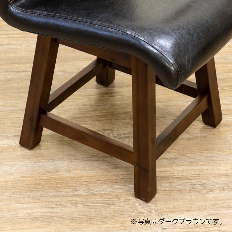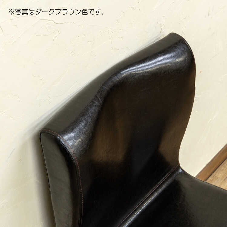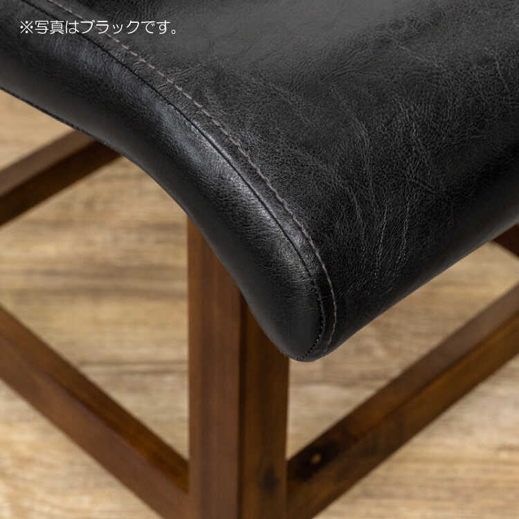 座面・背もたれの張地は本革のような滑らかな手触りのPUレザーを採用。合成レザーを使用しているので汚れてしまってもサッと拭き取るだけとお手入れ楽々。汚れやすいダイニング空間にもってこいです。座面は座りやすいよう傾斜のある構造で、よりリラックスして寛ぐことができます。背もたれもカーブがかかったデザインでしっかりフィットし、背中を優しく支えてくれます。