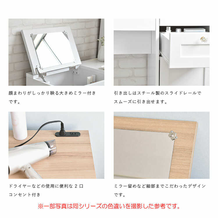 たっぷり収納できる引出しや天板下&2口コンセント付きなので、これ一つでメイクやヘアセットが完了します。