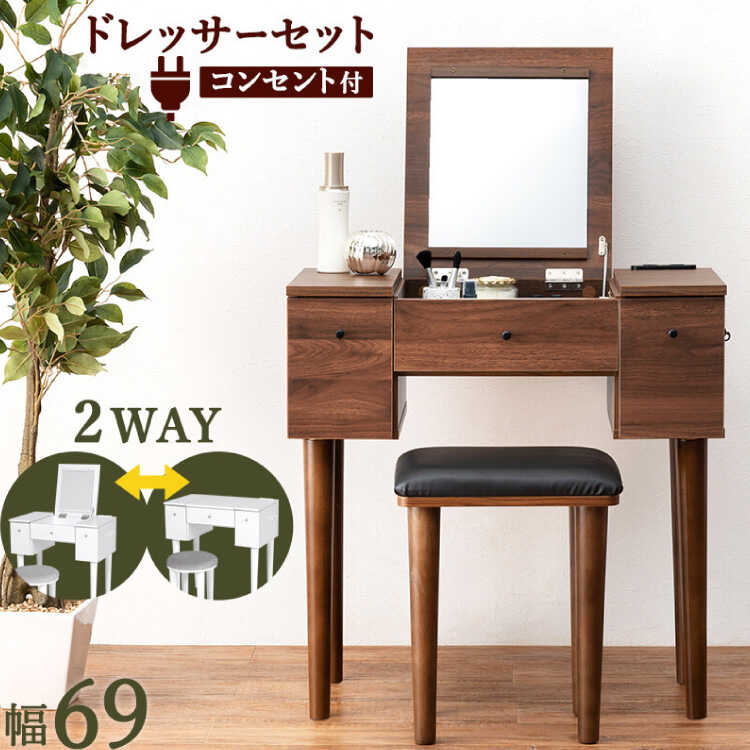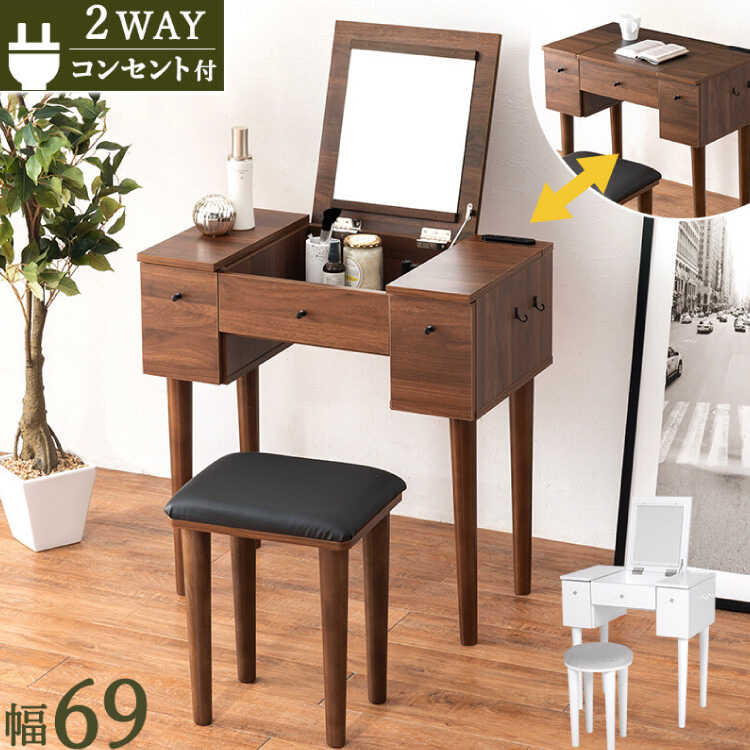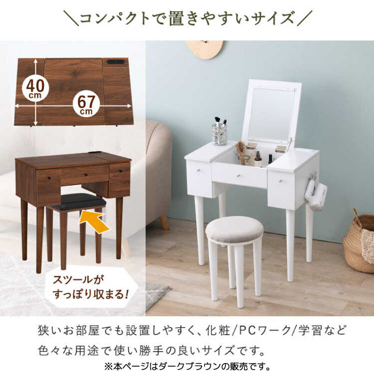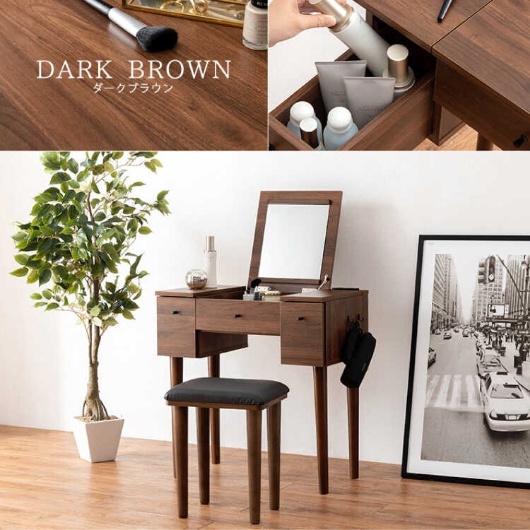 幅69cm・シンプルでコンパクトなドレッサーデスク(スツール付き・ダークブラウン)
