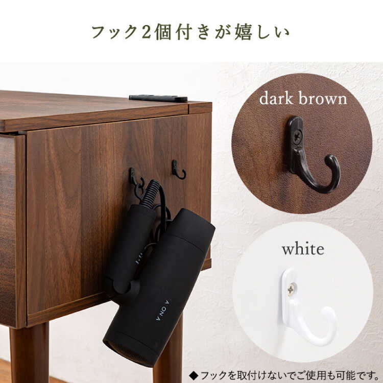 付属で取り付け自由なフックが2個付いており、ドライヤーや荷物を引っ掛けるのに便利です。
