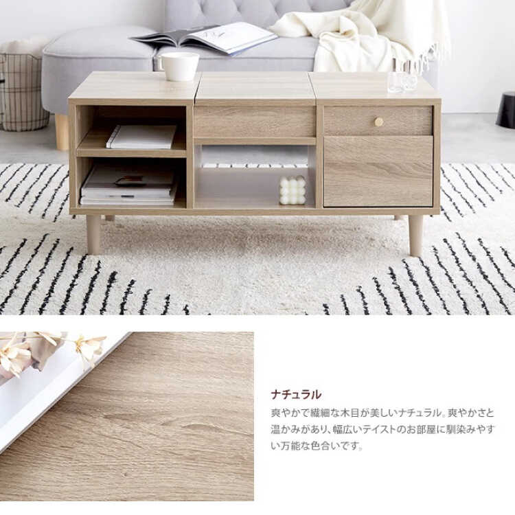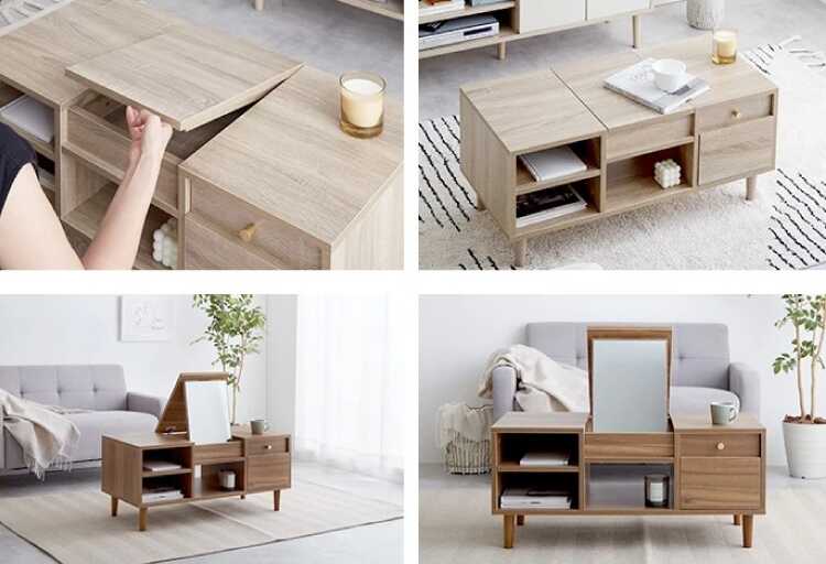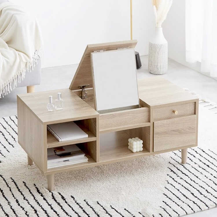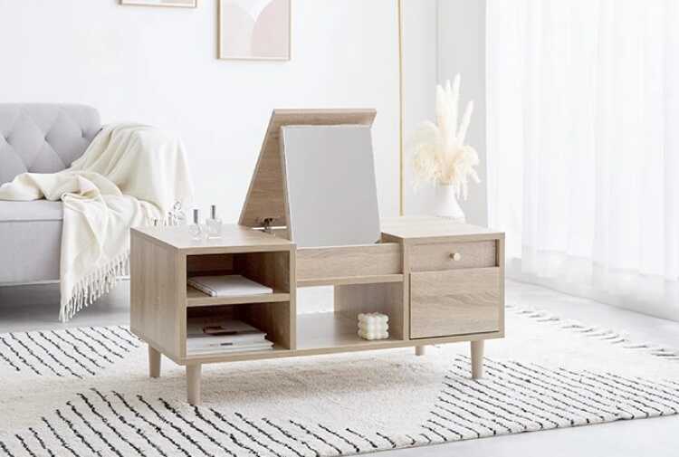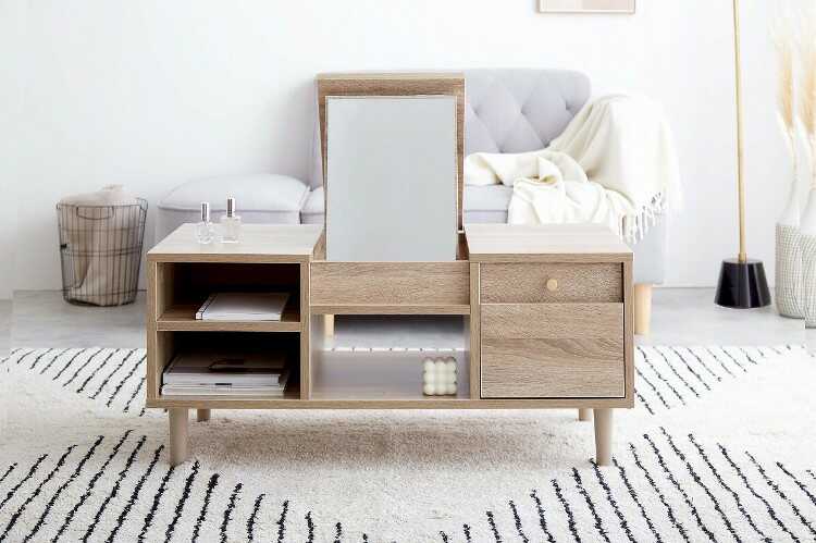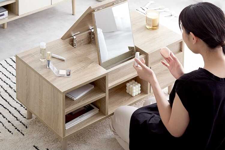 普段は食事や読書をするリビングテーブルとして使用し、メイク時は天板下に入っている鏡を出してドレッサーのようにお使いいただけます。