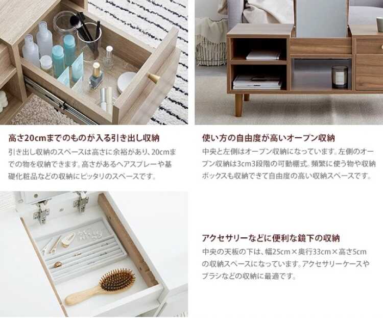 天板下には深さのある引き出しやオープン収納を設けているため、化粧水やコスメ・アクセサリーなどかさばる物もスッキリ収納できます。