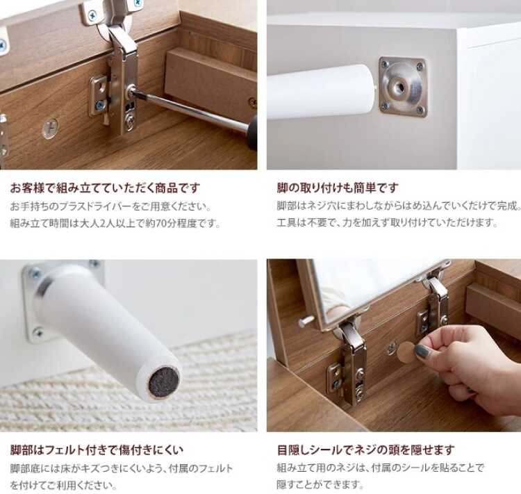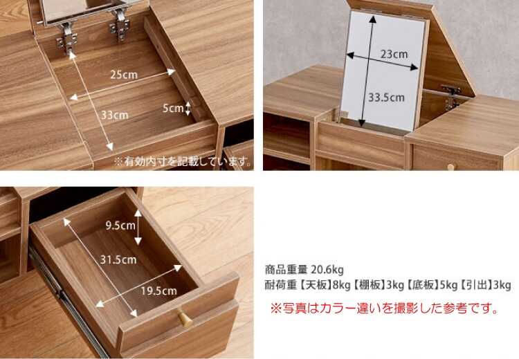 耐荷重(約)…天板8kg、棚板3kg、底板5kg、引出3kg注意事項 ※ドレッサーテーブルの販売です・小物等は付属しません。