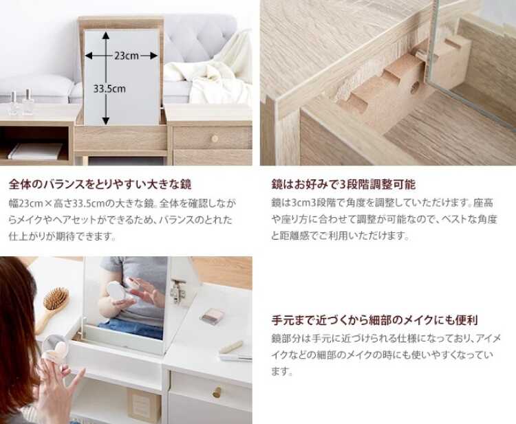 鏡は3段階で角度調整ができるため、近づけたり全体を見たりとベストな角度と距離感でご利用いただけます。