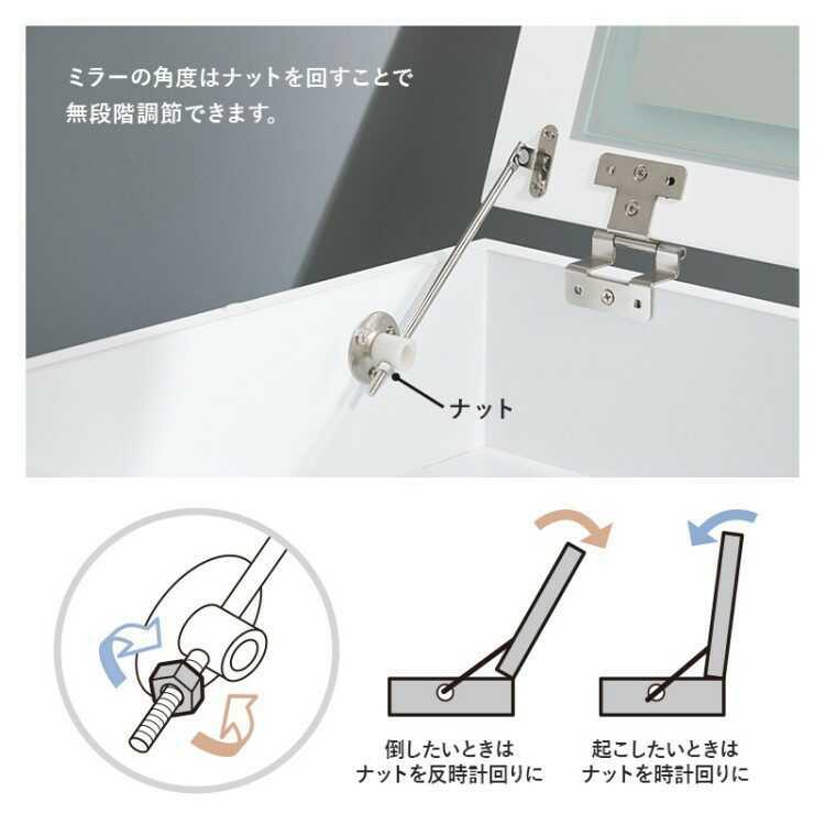 天板裏は幅33cm×高さ27cmの鏡が配されています。鏡は身長に合わせてお好みの角度に無段階調節が可能。角度調節はナットを回すだけで簡単に調節ができます。さらに鏡の縁には高輝度で長持ちなLEDライトを搭載。ライトの色は暖色・自然光・寒色の3色から自由に切り替えが可能。さらにボタンを長押しすることで明るさも無段階で調節することができます。鏡を閉じると天板になり、デスクやサイドテーブルとしても使えます。
