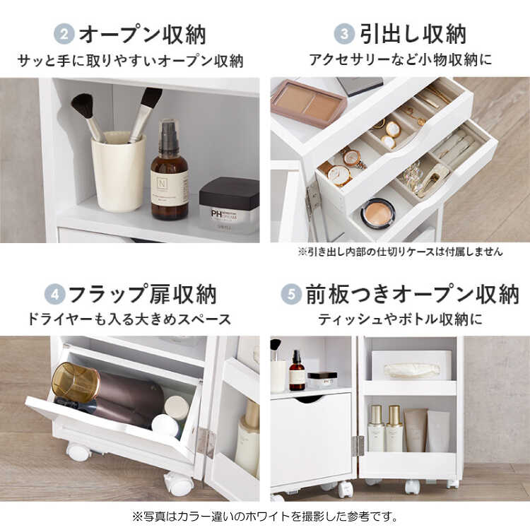 収納は天板下収納、オープン収納、引出し収納、フラップ扉収納、前板付きオープン収納の5種類をご用意。これ一台でアクセサリーやリップなどの細々した小物からドライヤーや化粧水などのボトルなどたっぷり入ります。