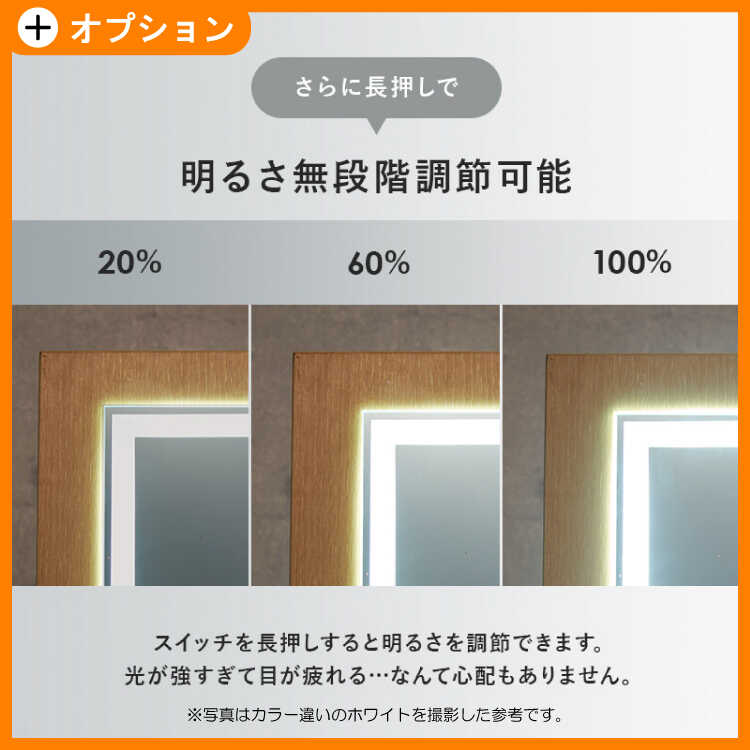 オプション(要追加代金)で鏡にLEDライトを搭載することができます。鏡の縁にライトがあることで、普通の鏡では見えにくい細かい所までチェックできます。ライトは外出先の照明環境に合わせて、温かみのある暖色・太陽光に近い自然光・オフィスを再現した寒色など3色の切り替えが可能。鏡下部に配されたスイッチを長押しすると明るさの無段階調節もできます。