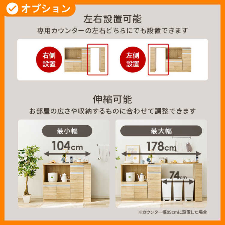 拡張テーブル(※オプション):(約)幅104cm、奥行40cm、高さ84cm材質 本体:プリント紙化粧パーティクルボード(主材)、メラミン樹脂化粧パーティクルボード(天板/スライド棚)、スチール(取手)