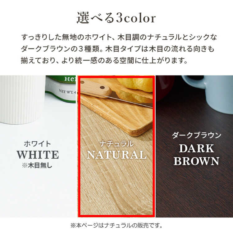 ワイドサイズの激安キッチンカウンターはナチュラルな木目柄で、優しい温もりのある印象です。取っ手はフラットで使い勝手の良いシンプルデザイン。人気の北欧テイストにもすっと馴染みます。別ページで同シリーズの別カラーやサイズ違いを展開していますので、是非お好みに合わせてお選び下さい。(※本ページは幅118cm・ナチュラルの販売です)