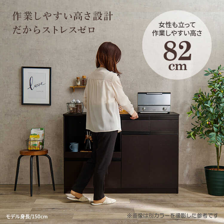 幅118cmとワイドサイズでたっぷり収納できる激安キッチンカウンター。奥行は40cmとスリムでキッチンの動線を圧迫せずに設置できます。高さは82cmと立ったまま天板上でお食事の盛り付け等の作業がしやすい設計です。ロータイプなので狭いキッチンに設置してもあまり圧迫感を与えません。オプションで拡張テーブルの有無をお選びいただけます。