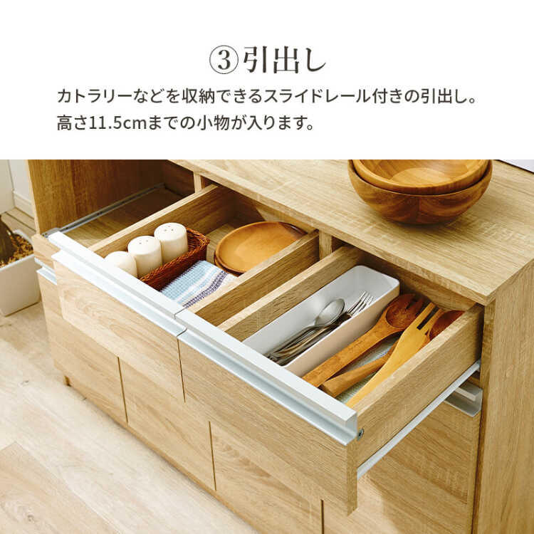 収納は天板スペース・スライド棚・引き出し・可動棚収納・下段収納と多機能な構成で、キッチン周りの食器や調理器具・家電をひとまとめにできます。天板・スライド棚は水や汚れに強くお手入れ簡単なPVC仕様。引き出し・スライド棚はスライドレールを使用しているのでスムーズに開閉可能です。また、スライド棚の背面には家電に便利な2口コンセント付きです。可動棚は3cm間隔で9段階の高さ調節ができ、効率よく収納ができます。