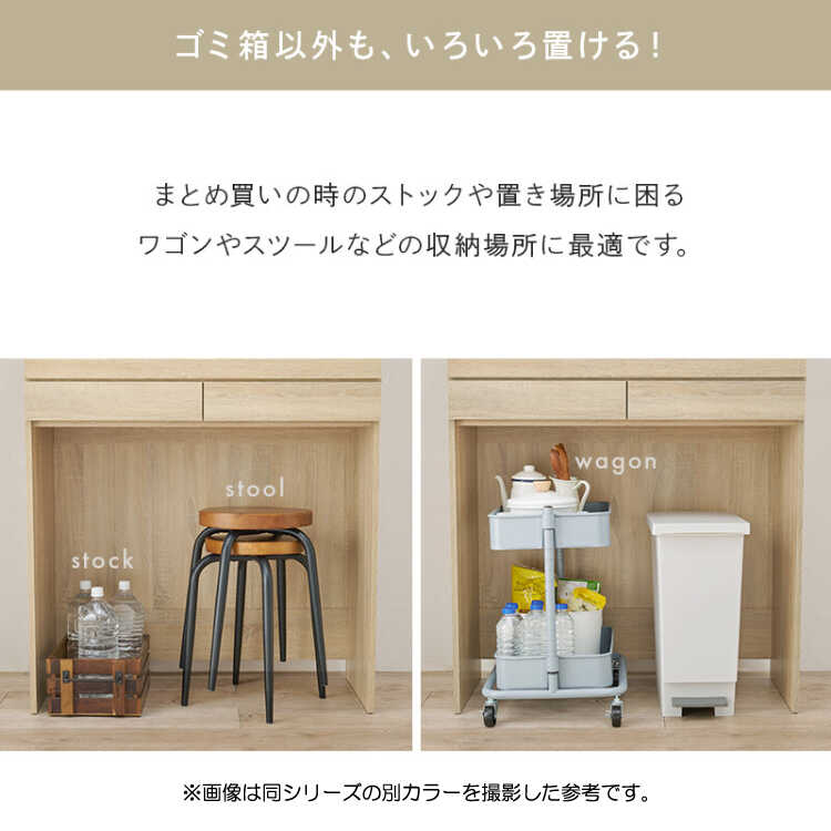 下部のオープン収納は高さ73cmの広さがあり、ゴミ箱収納として使用可能です。デッドスペースになりがちなゴミ箱上を収納場所として有効活用でき、手狭なキッチンもすっきりとした印象に。また、横板が目隠しになるので、ゴミ箱の生活感を軽減できるのも嬉しいポイントです。ゴミ箱の他にも来客用スツール・ワゴンなど高さのある物を収納できます。