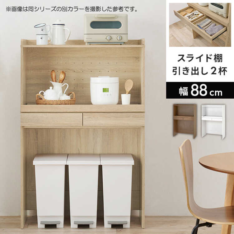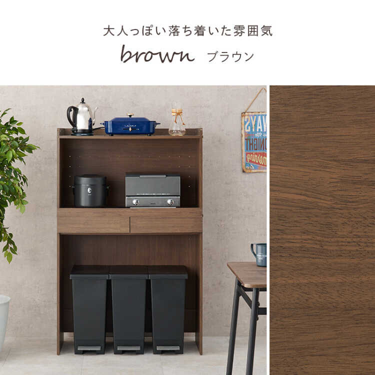便利なオープン収納付きレンジ台は、スライド棚の背板に通気口が付いているので、家電から出る蒸気等の熱を逃がしやすく安心です。使いやすいシンプルな設計で自由度の高い収納をお楽しみいただけます。ブラウンカラーの他にも同シリーズでナチュラル・ホワイトウォッシュを展開していますので是非お好みでお選び下さい。(※本ページはブラウンの販売です。)
