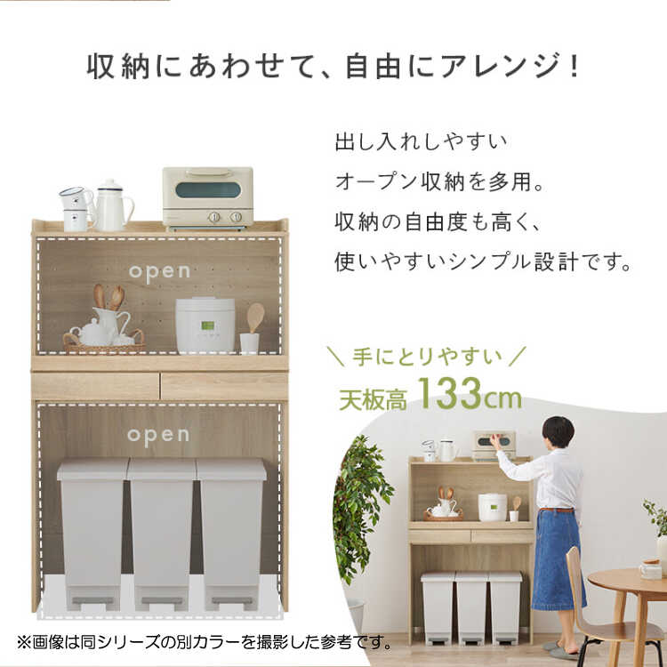 高さ73cmのオープンスペースにゴミ箱が置けて、上部を収納場所として有効活用できる便利なレンジ台。キッチンスペースを無駄なく使えるので手狭な場所にもおすすめです。また、横板が目隠しになるので、ゴミ箱の生活感が軽減できるのも嬉しいポイント。ゴミ箱の他にも来客用スツール・ワゴンなど高さのある物の収納として活躍します。
