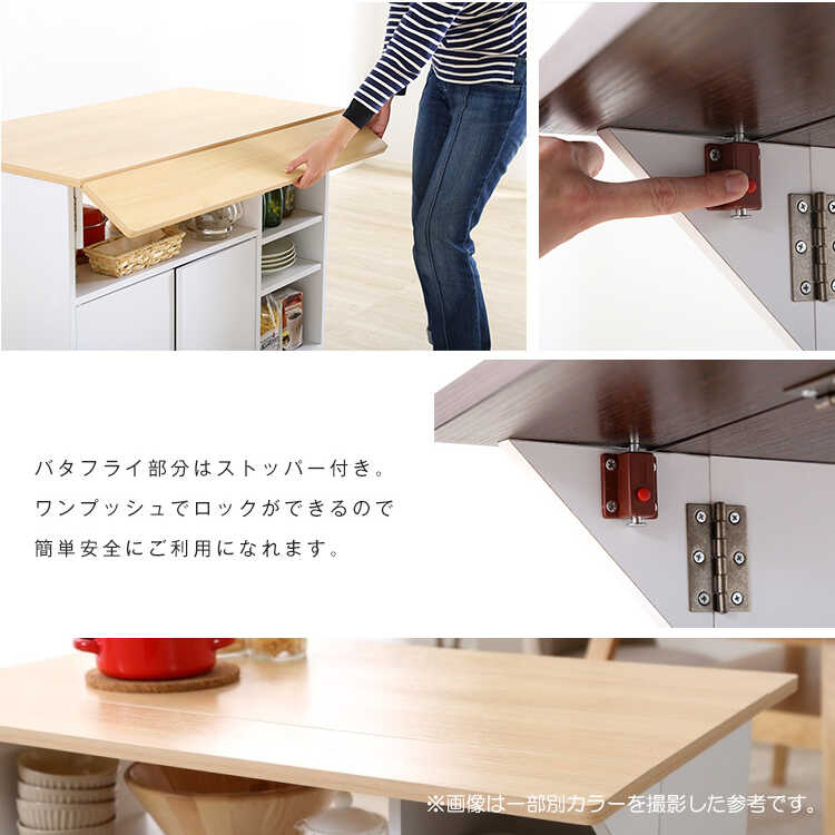 料理や趣味の作業台として使用したり、ダイニングテーブルの拡張用にレイアウトしたりと、様々な用途で活躍します。天板のバタフライ部分は使うときだけ広げて使用でき、折りたためばスペースを取らずにコンパクトに収納可能です。また、伸長時にバタフライ部分をワンプッシュでロックでき、簡単&安全にご利用いただけます。