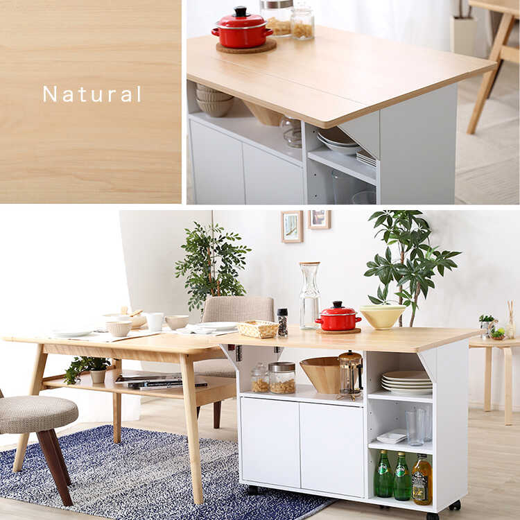 使いたいときに天板を伸長できるキャスター付きのキッチンワゴンです。折りたためば場所を取らないコンパクトサイズになり、シーンに合わせた使い分けができます。本体部分は収納スペースになった便利な設計で、脚元には移動に活躍するキャスターを搭載しました。カラーは爽やかな木目調のナチュラルで、キッチンに明るい印象をプラスします。