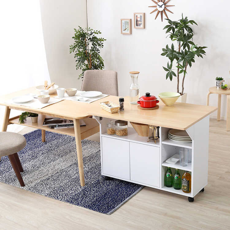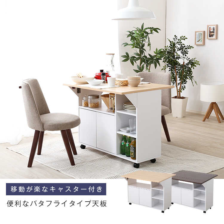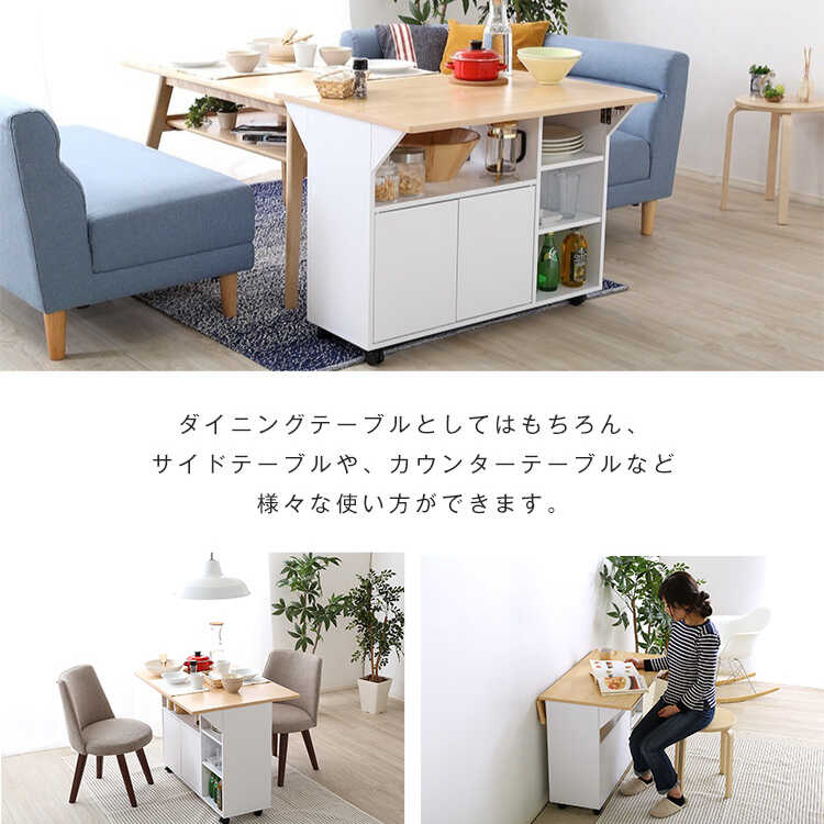 料理中の盛り付け台や趣味の作業台として使用したり、食卓テーブルとして使ったりと様々な用途で活躍します。ダイニングテーブルの拡張用としてレイアウトすれば、大人数での自宅パーティーなど来客時にも対応できて便利です。また、伸長時にバタフライ部分をワンプッシュでロックできるので、簡単&安全に利用できて安心です。