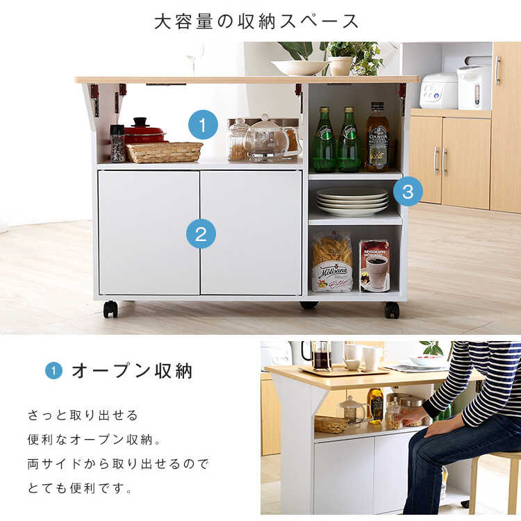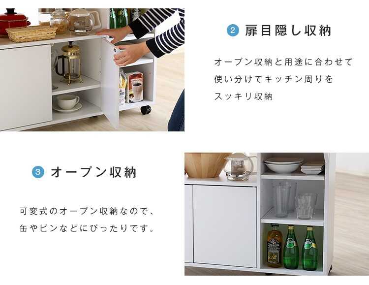 オープン棚×2と扉収納が設けられており、食器や食品ストックなどを収納できます。オープン棚は物を出し入れしやすく使い勝手抜群。扉収納は収納物を隠すので生活感を軽減できます。脚元は移動に便利なキャスター付きです。レイアウトの幅が広がり、気軽にお部屋をイメージチェンジできます。また、お掃除の際もスムーズに移動ができるので掃除機がラクラクです。