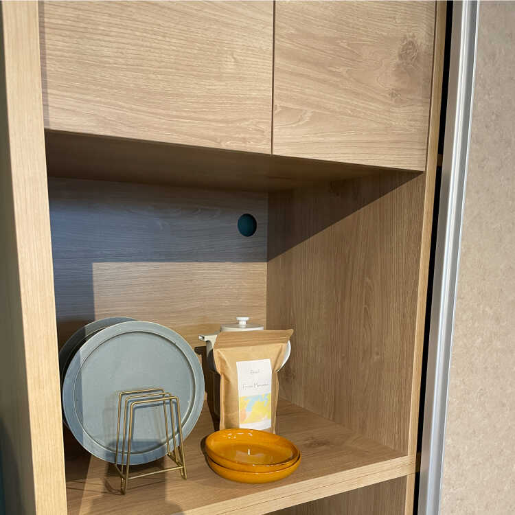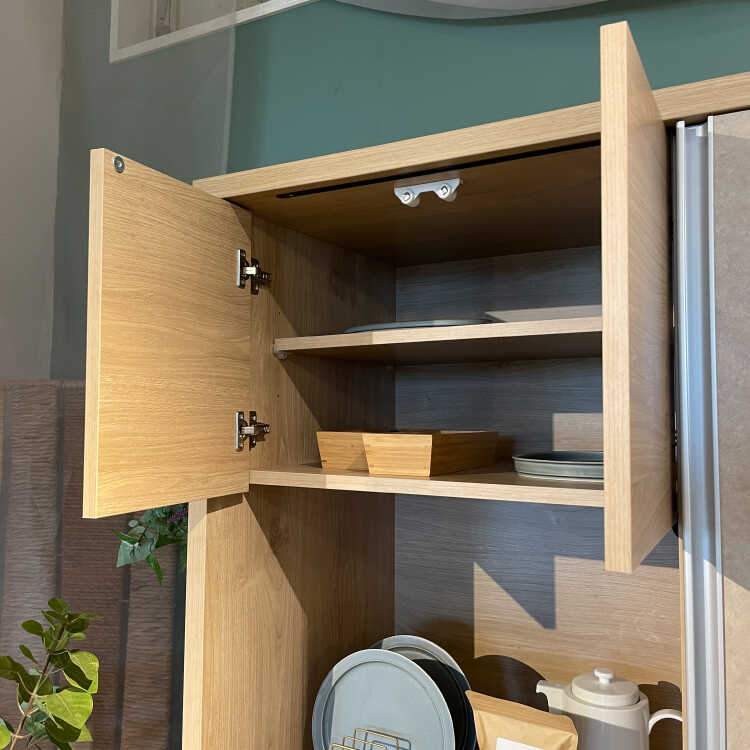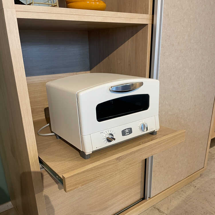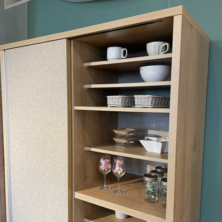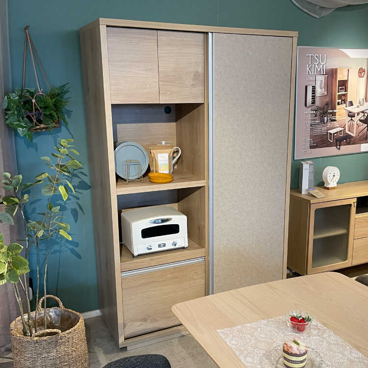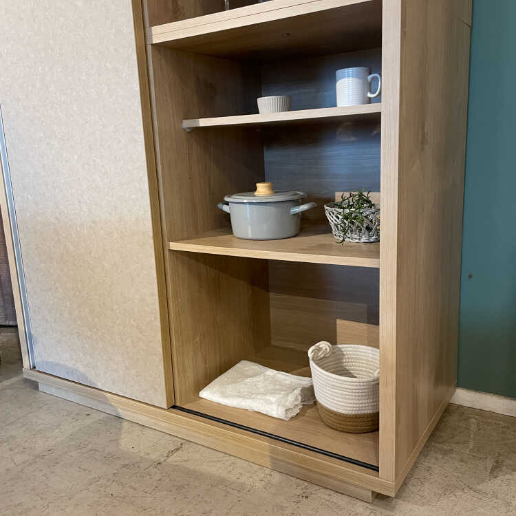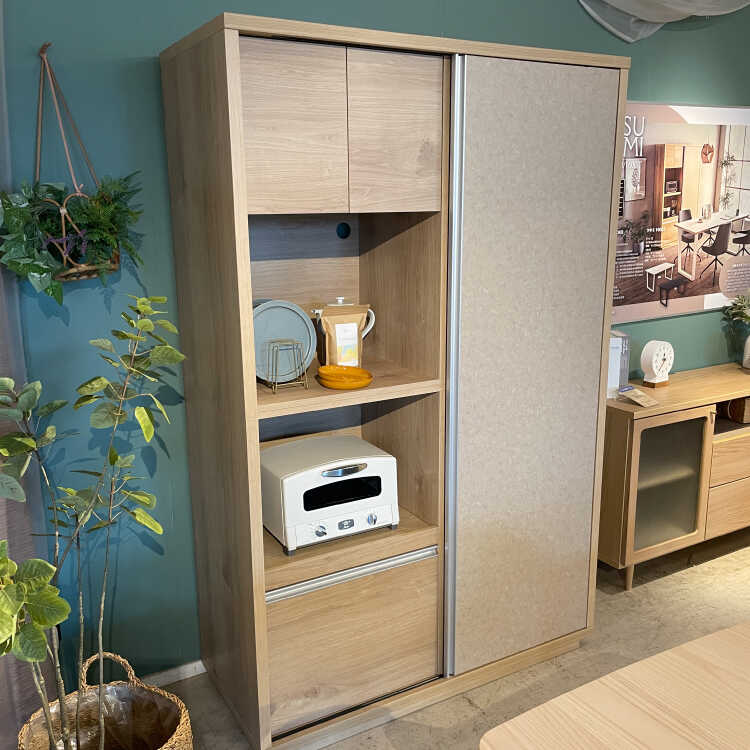 扉を左右にスライドさせるので、食器棚の前に引き出しや扉の開閉スペースが必要なく、狭い空間でも圧迫感が少なめです。