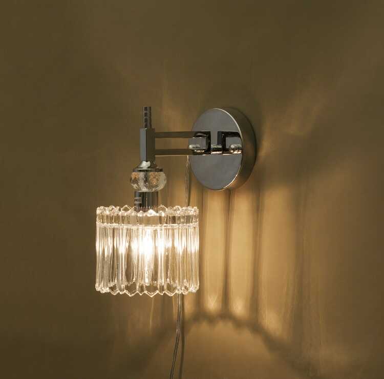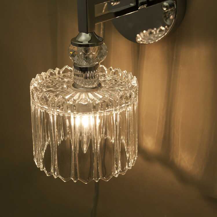 シェードは輝きが上品で美しいクリスタルガラスを採用。安価なアクリルパーツとは輝きが異なり重厚感があります。クリスタルガラスは日光に照らされているだけでもキラキラ輝くので、インテリアとしても大活躍します。明かりを点けると雰囲気が一変。壁に陰影を生み出し、ホテルのようなラグジュアリーな空間を演出します。フレームはスタイリッシュなクロームを採用。キラリと輝くクロームはモダンでクールな雰囲気も漂います。