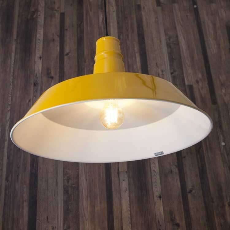 ヴィンテージスタイルの食卓テーブル用ペンダントライト1灯。カラーはお部屋の雰囲気がパッと明るくなるイエローを採用。吊るすだけでお部屋の主役になるポップなカラーリングで、消灯時もインテリアとしてお洒落に飾っていただけます。素材はアイアンを使用しており、シンプルな構造ながらも外国の工場にコーディネートされていそうなお洒落な仕上がりです。シェードは傘型タイプなのでダイニングテーブル上や作業台上に適しています。