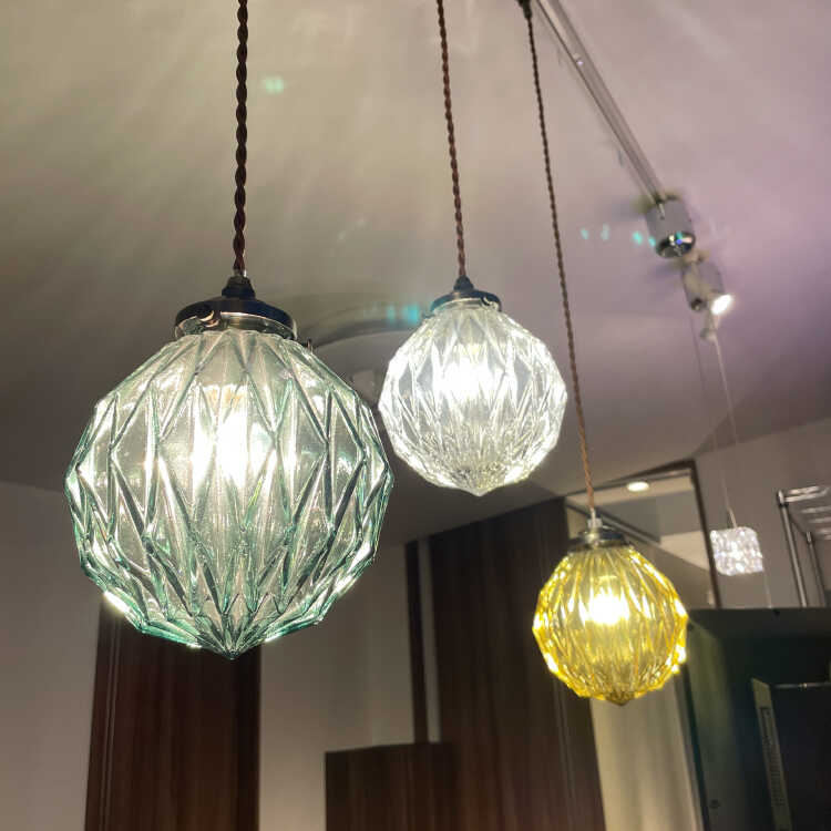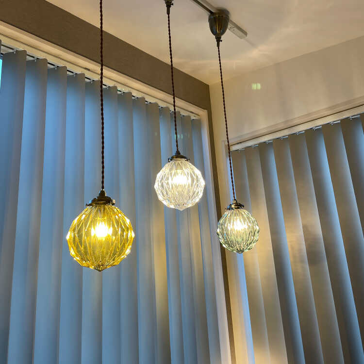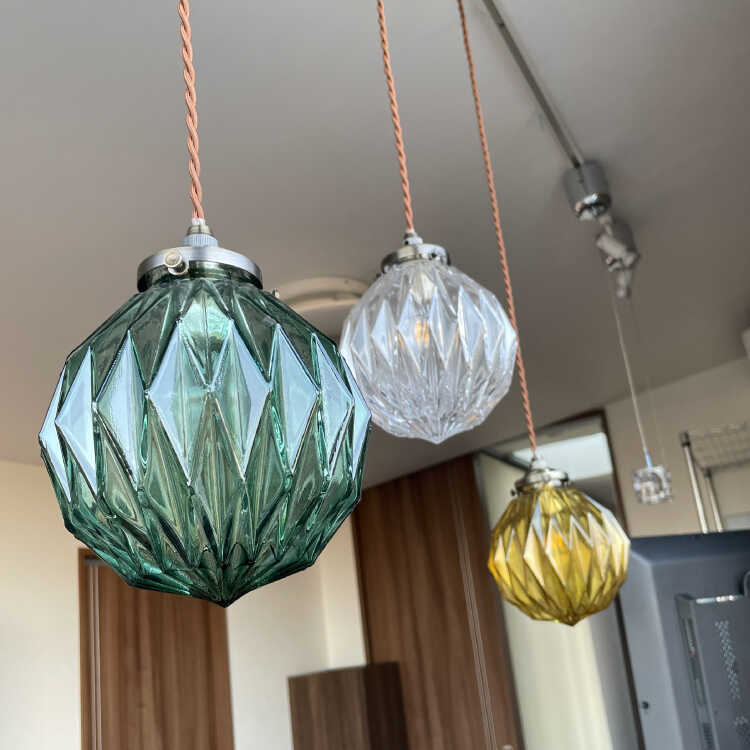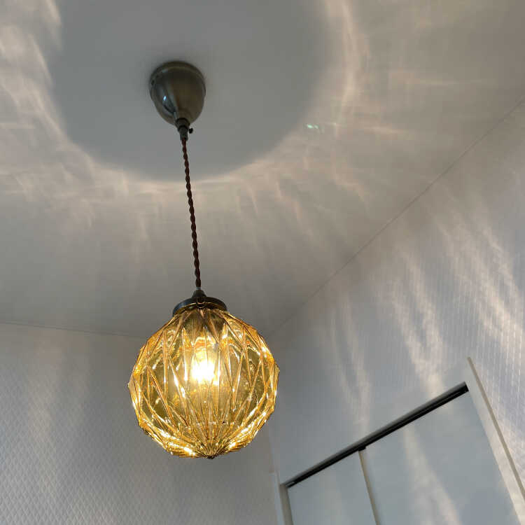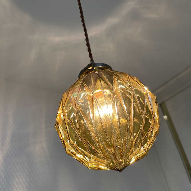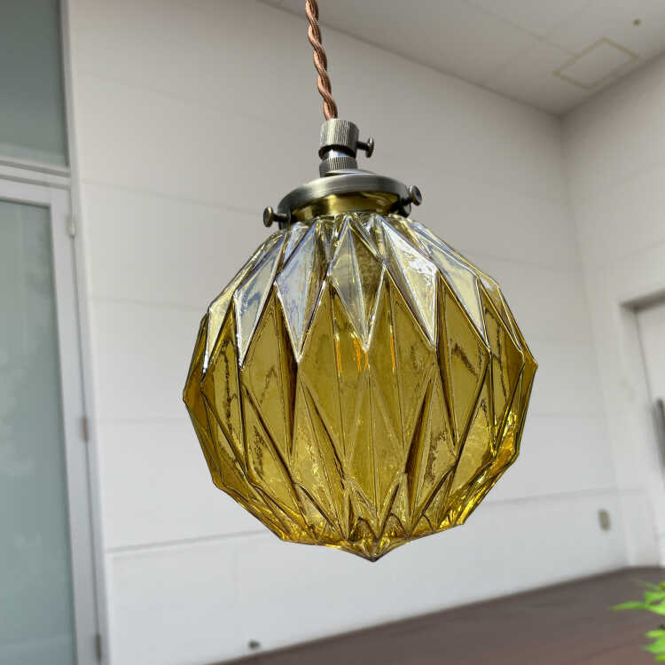 カットガラスが綺麗な丸型1灯ペンダントライト(アンバー色・LED対応)