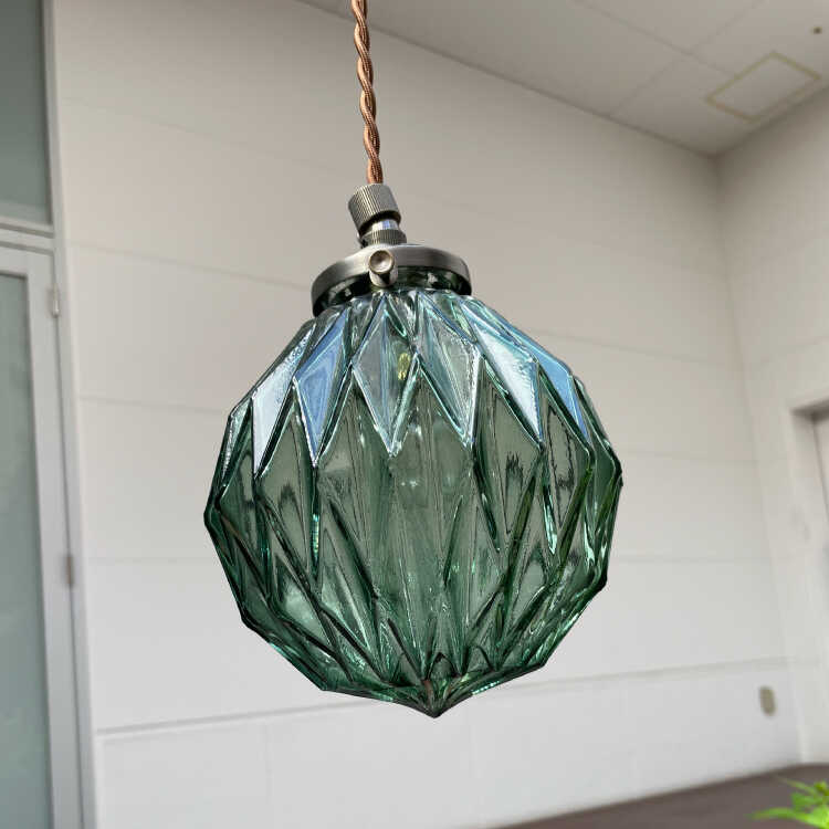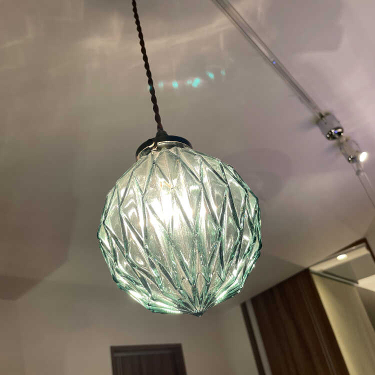 カットガラスが綺麗な丸型1灯ペンダントライト(青ブルー色・LED対応)