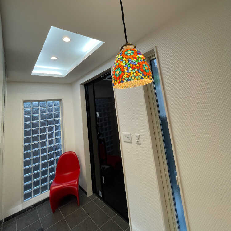 電球を灯すとカラーガラスに光が透過してステンドグラスのような表情を見せてくれるペンダントライト。