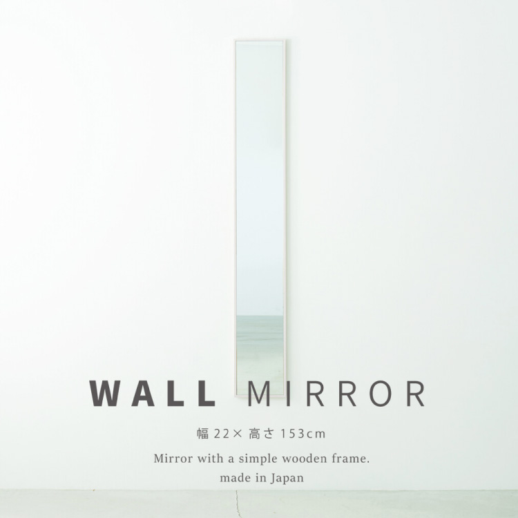 幅22cm×高さ153cm・極細枠のスリムな壁掛けウォールミラー(白ホワイト/日本製/飛散防止)【受注生産・納期10日前後】