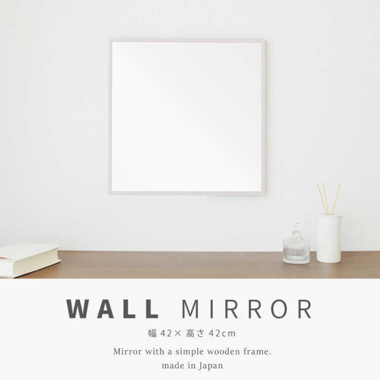 幅42cm・リビングで使いやすい正方形ウォールミラー(白ホワイト/日本製/飛散防止/極細枠)【受注生産・納期10日前後】