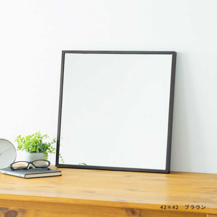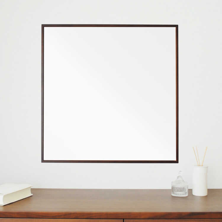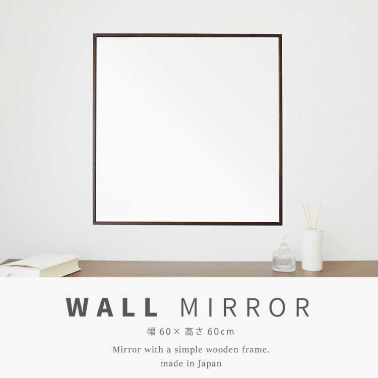 幅60cm・ラージサイズ正方形ウォールミラー(ブラウン色/日本製/飛散防止/極細枠)【受注生産・納期10日前後】