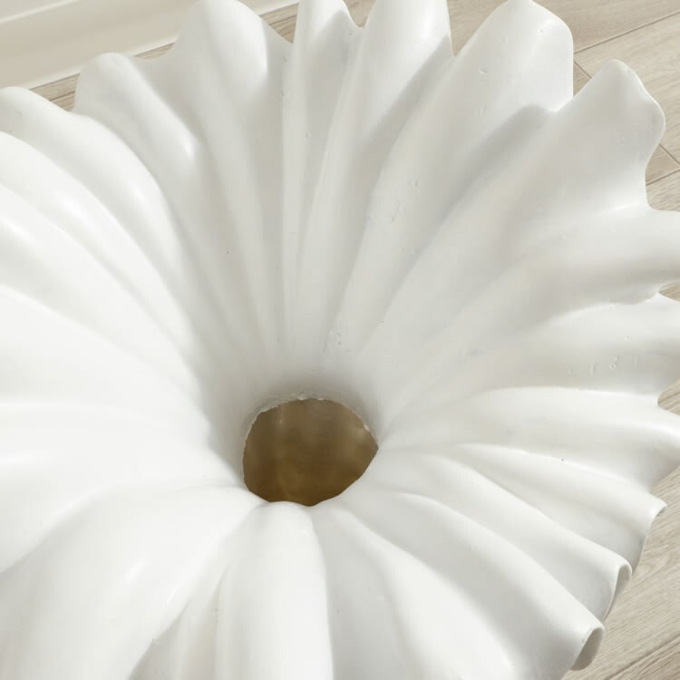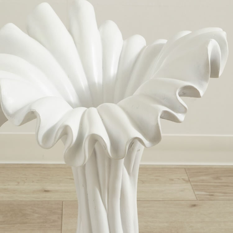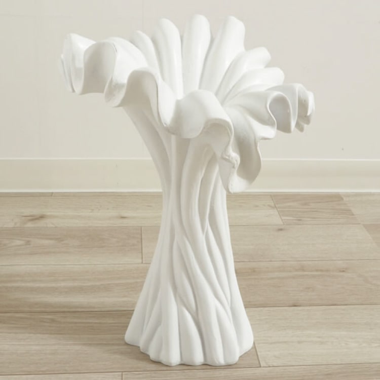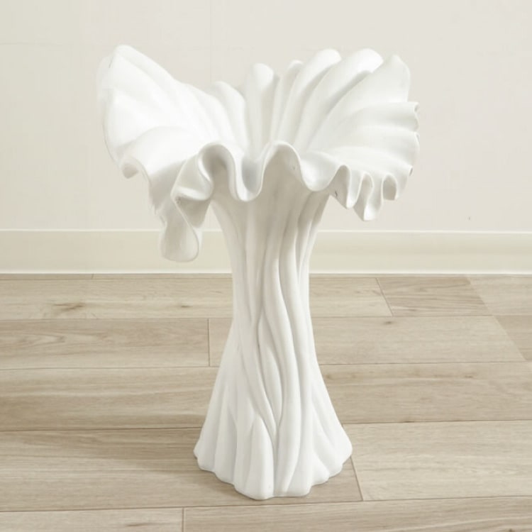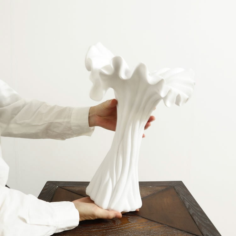 布のレースのように優美な曲線がデザインされた、白く美しいインテリア花瓶。