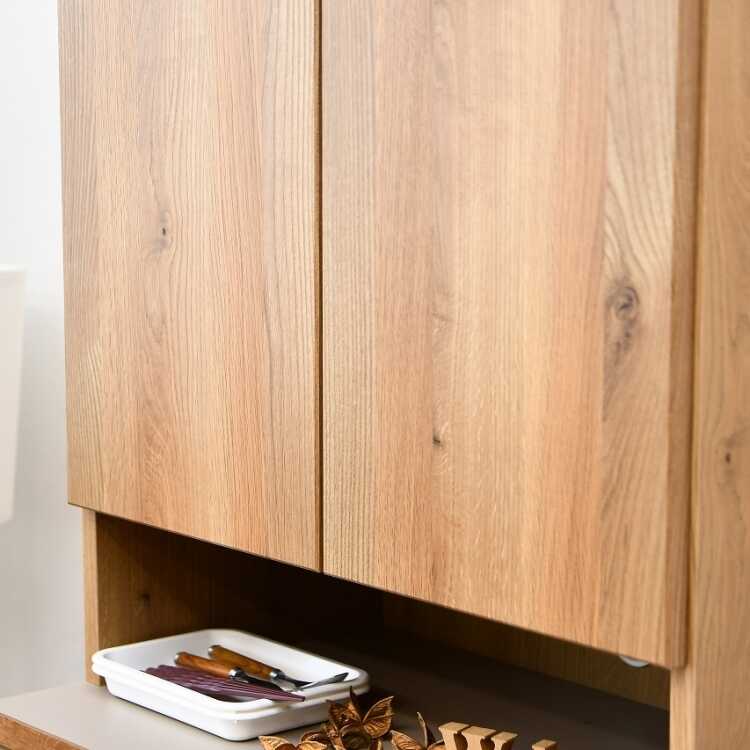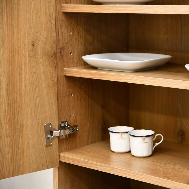 ①両開き扉収納…3枚の棚板で効率の良い収納が可能。高さ調節もできます。ダボは差し込むだけの簡易的なものではなく、ネジ式になったこだわりの高さ。扉には内部にホコリが侵入しにくい樹脂カバー付き。