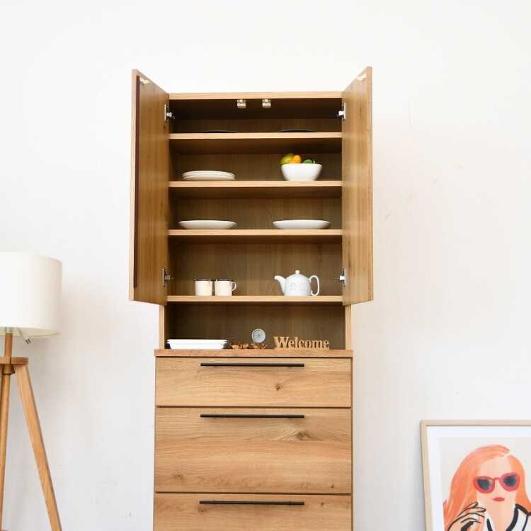 元々はキッチンスペース用の収納として作られましたが、開き扉・大型引き出し・オープン収納という理想的な組み合わせから、リビングや書斎でも多数使われている人気のシェルフです。