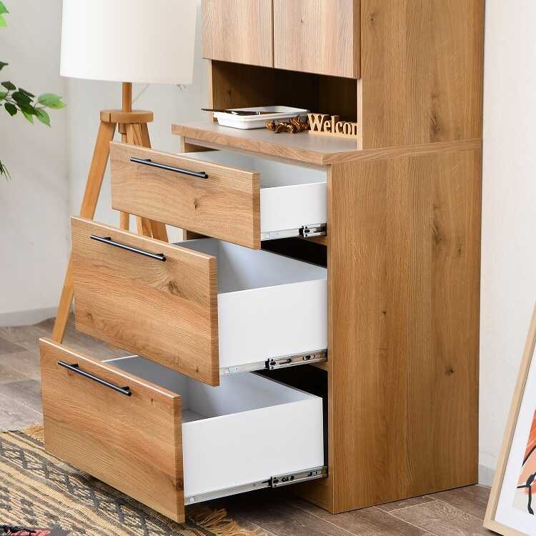③引き出し…3段構成で、最上段のみ浅型です(書類や小物の収納に便利)。全ての段にフルスライドレールを採用。取手は握りやすくお洒落なデザインで、ナチュラルカラーの本体に映えます。