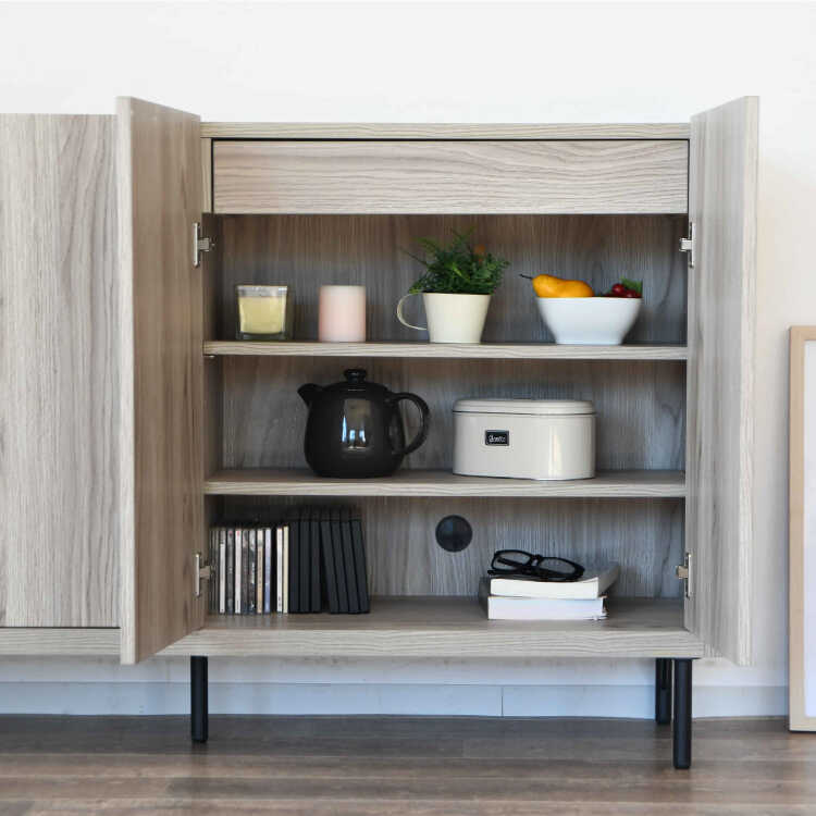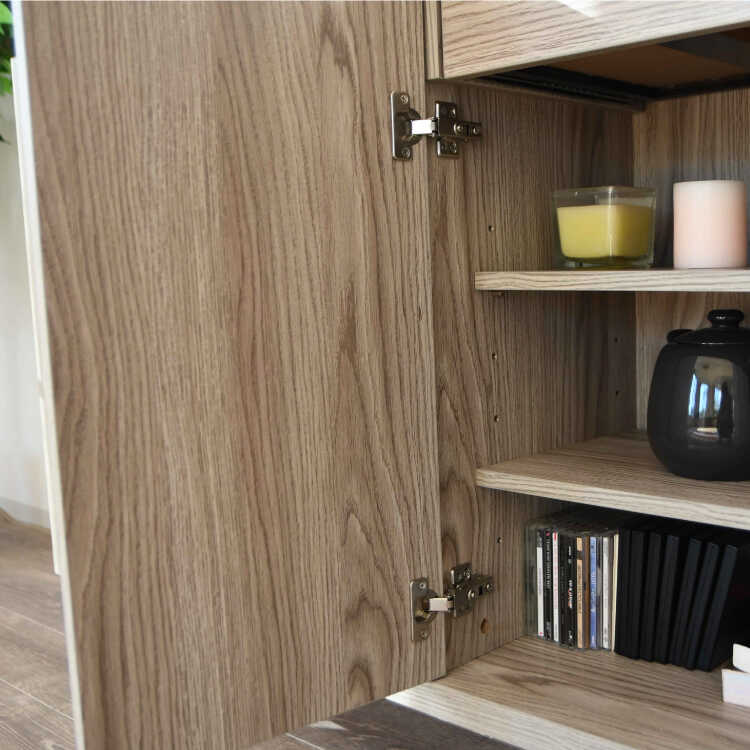 幅150cmという圧倒的な収納力を持つキャビネットなので、どんどん収納して扉を閉めてしまえば周辺もスッキリ。