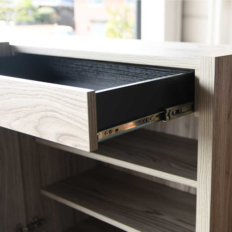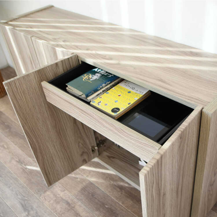 内部は大きく左右二つのスペースに分かれており、それぞれの内部に引出し、棚板2枚、背面にコード用ダクトを配しています。